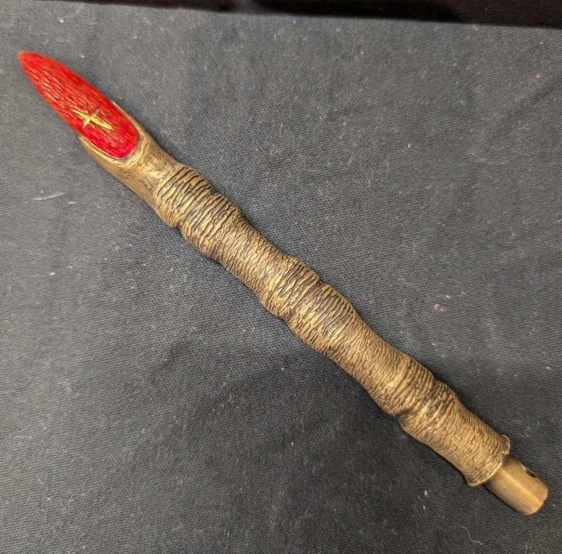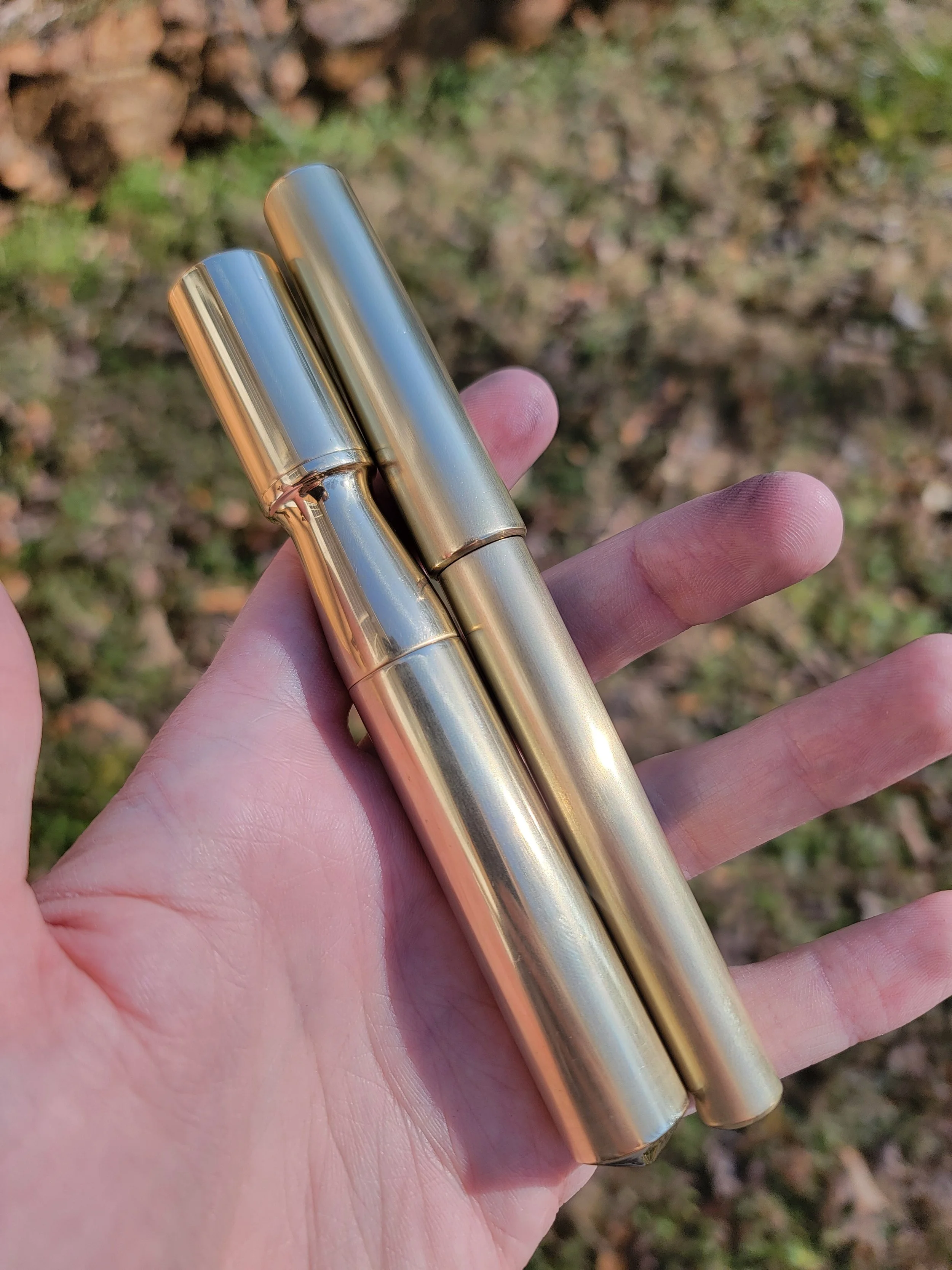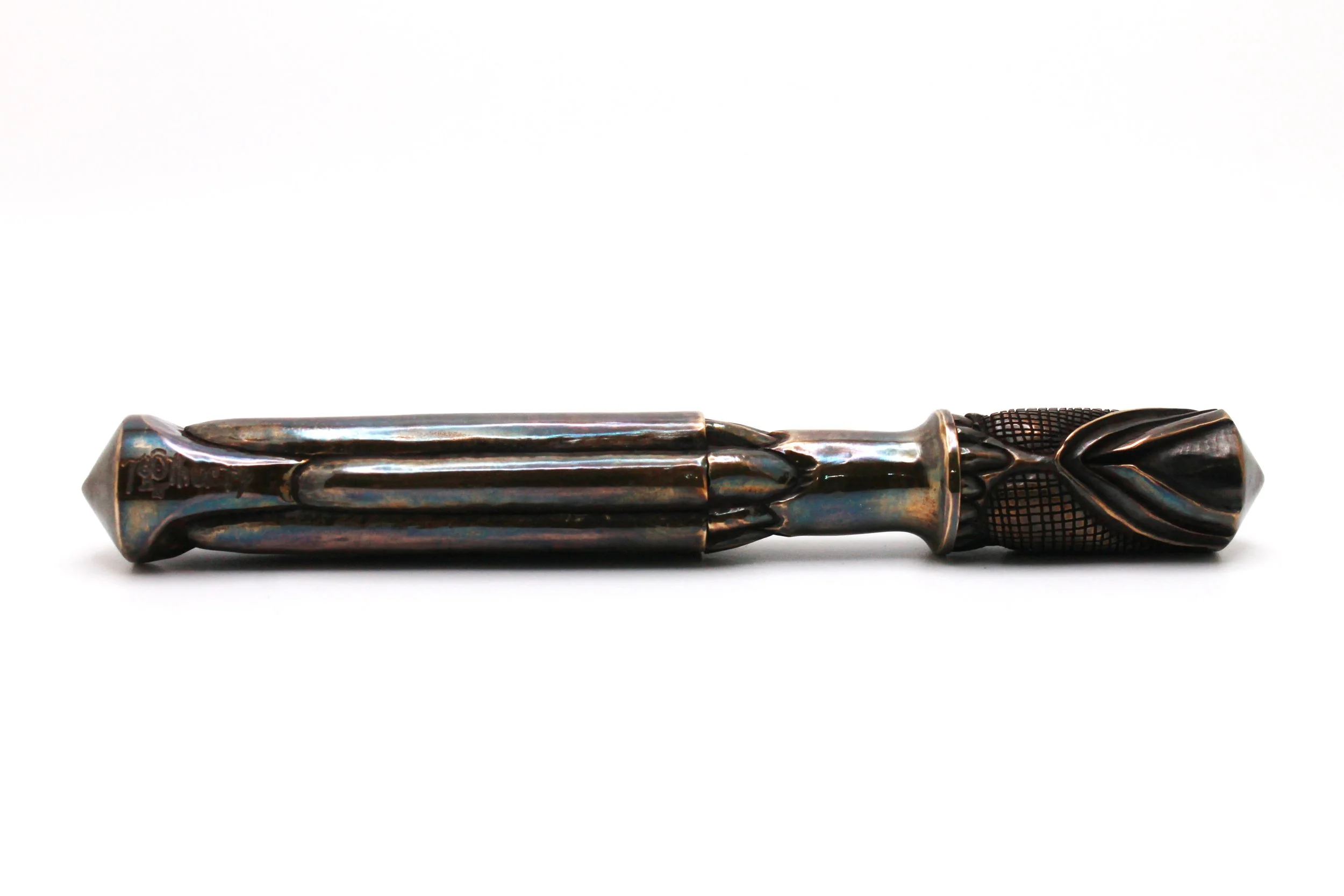 Anyone who saw the Little Hollow table at this year’s DC pen show saw the Monster Finger pen. Where on earth did THAT come from?? “I’ve always been fascinated with blacksmithing. Knife making is one source of inspiration – it can’t just be art, it has to be durable art.” After seeing some knife handles made in an alloy called “gem bronze,” he contacted the maker of the alloy, @mikes_metalworking of Portland OR, and asked for a rod of it. “Mike experiments with a ton of really cool alloys, and we have a lot of conversations regarding which materials are most compatible with pens, and Mike sends me rods of them.”