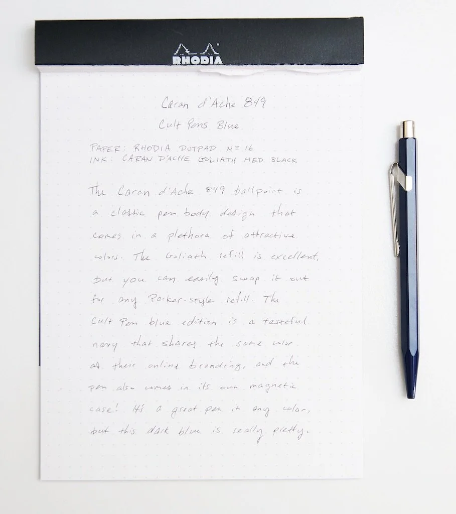 The size of the 849 is also an important factor. This is a small pen. Modern pen designs tell us that the market prefers slightly wider and longer pens, but designs like the 849 and Parker Jotter have sustained for decades by keeping their original silhouette. At 5 inches long and 0.5 oz. in weight it may not necessarily seem or feel small, but in comparison to similar pens it does land on that side of the ledger.