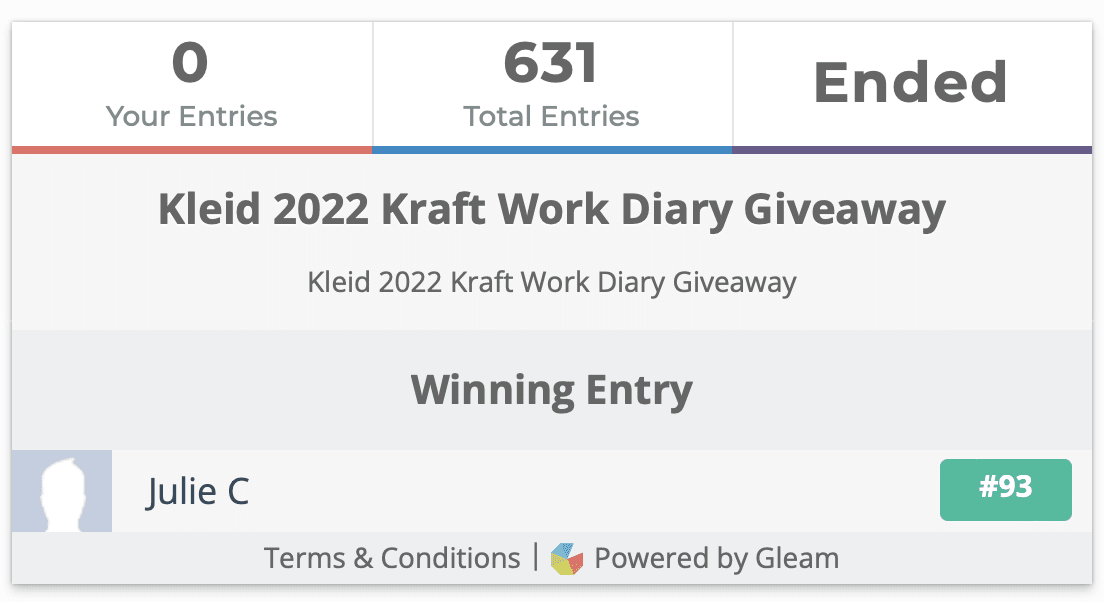 The Kraft Work Diary from Kleid Stationery is one of the more unique planners I’ve seen for this year. It’s certainly intriguing, if nothing else. I have one to give away this week, and the winner is: