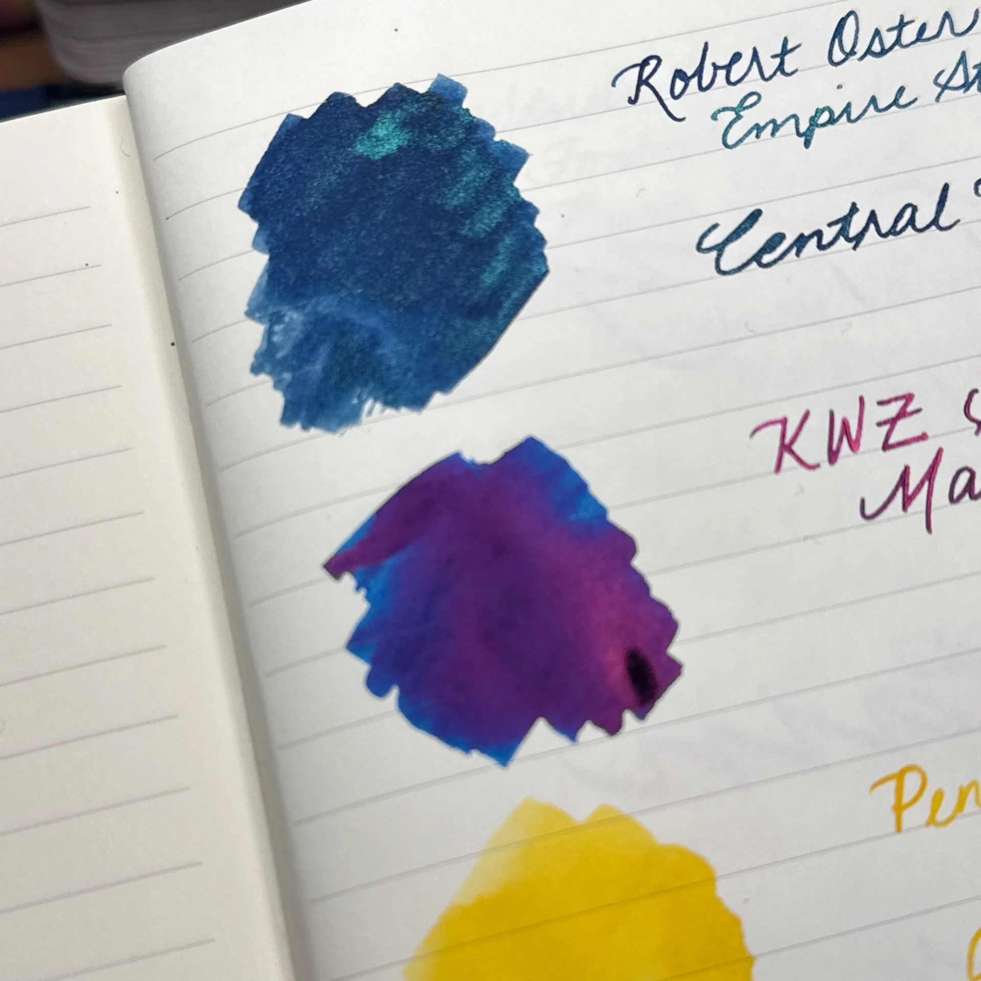 Swatches of Robert Oster x Empire State Pen Show Central Park Twilight (shimmer), KWZ Sheen Machine (sheen), Pennonia x Amarillo Stationery Amarillo Antiguo (brightness), Hosia Ink Studio Mung Shing (chromashading) and Sailor Ink Studio 150 (shading/chromashading).