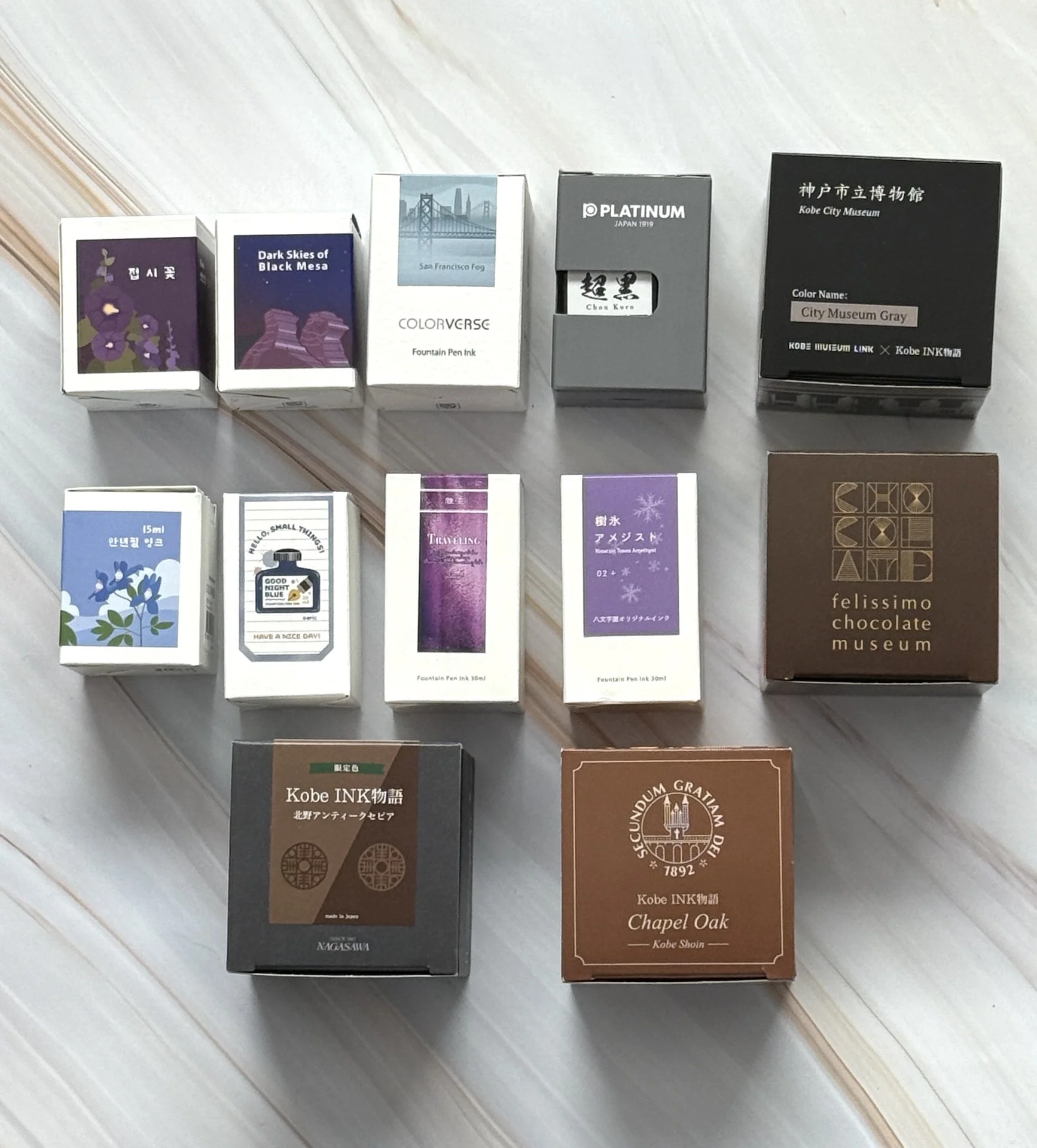 Inks – Colorverse Wildflower inks, Dark Skies of Black Mesa, and San Francisco Fog (2025 show ink), sample of Platinum Chou Kuro, Kobe City Museum Gray, Bitter Chocolate, Chapel Oak, Kitano Antique Sepia, two inks from Hachimonjiya and one from Yaching Style.