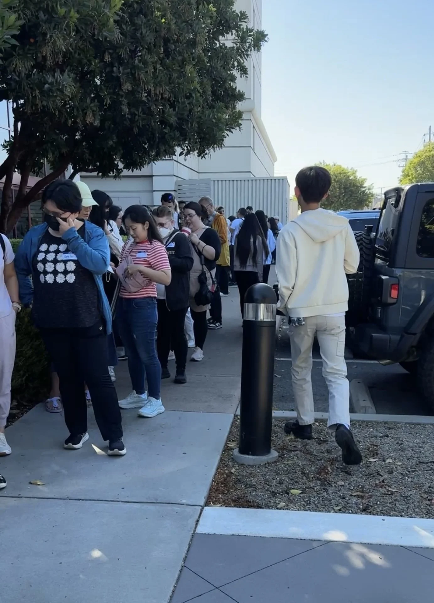 The line went around the corner to the metal wall and there were probably another 20 people in that little nook.