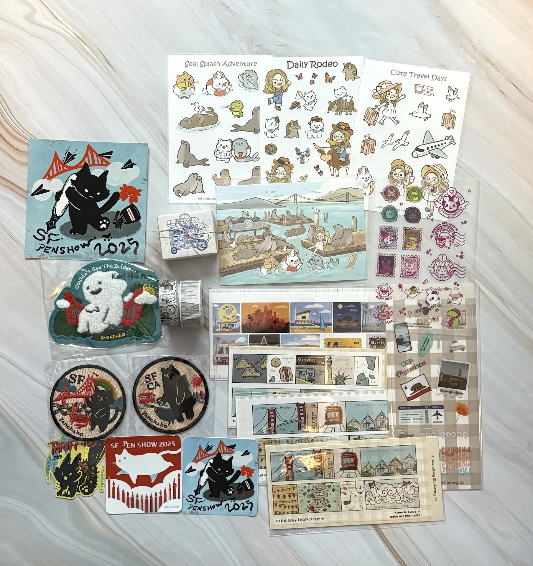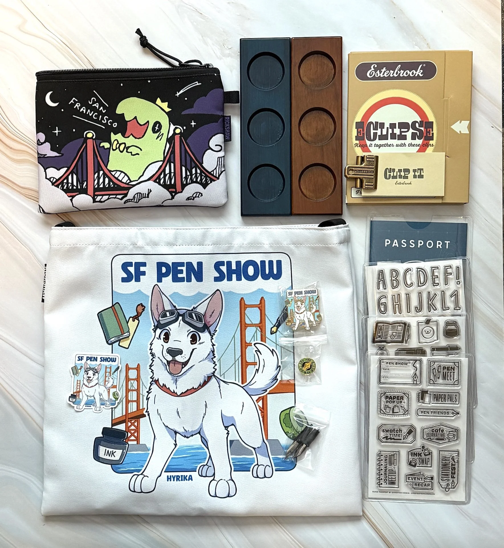 Rickshaw x Sakura Dragon pouch, ink bottle trays from Toyooka Craft, Eclipse clips from Esterbrook, clear stamps from Everyday Explorers, and SF show pin, sticker and bag.