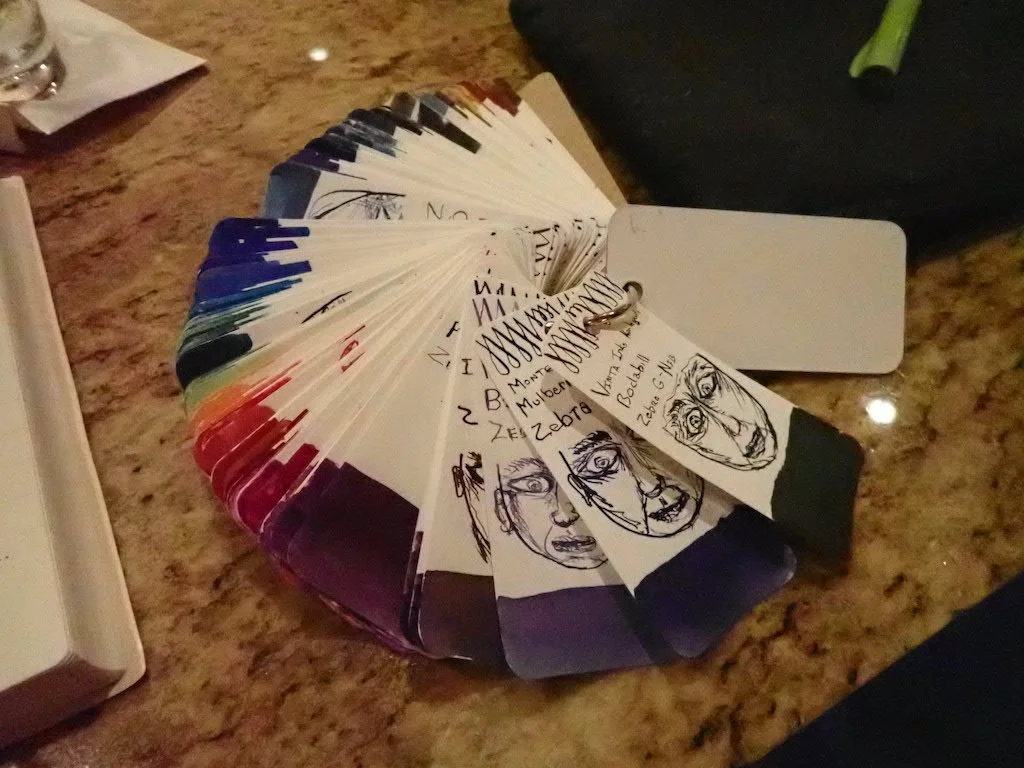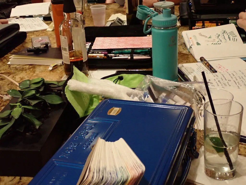 After dinner with my family, who came with me just for the hotel pool, I set myself up in the bar, waiting for the pen show after dark. I got a bit nervous, because for quite a while, no one came. It wasn't until after 8pm that the tables started to fill and pen rolls and notebooks came out, and the best part of any pen show began. That was what my soul needed. We had a blast passing pens and trying funky nibs and swapping inks, getting to know each other. There was the traditional whisky and cheese tasting. And, thank goodness, no giant gummy worm this year. There was, however, a surprise birthday party for Ralph, including pen-themed cupcakes that dyed everyone's teeth and skin blue, as if we'd all been drinking the ink. Good times. I didn't get to bed until I started getting the "are you okay?" texts from the fam--a sure sign that I've properly exceeded curfew.