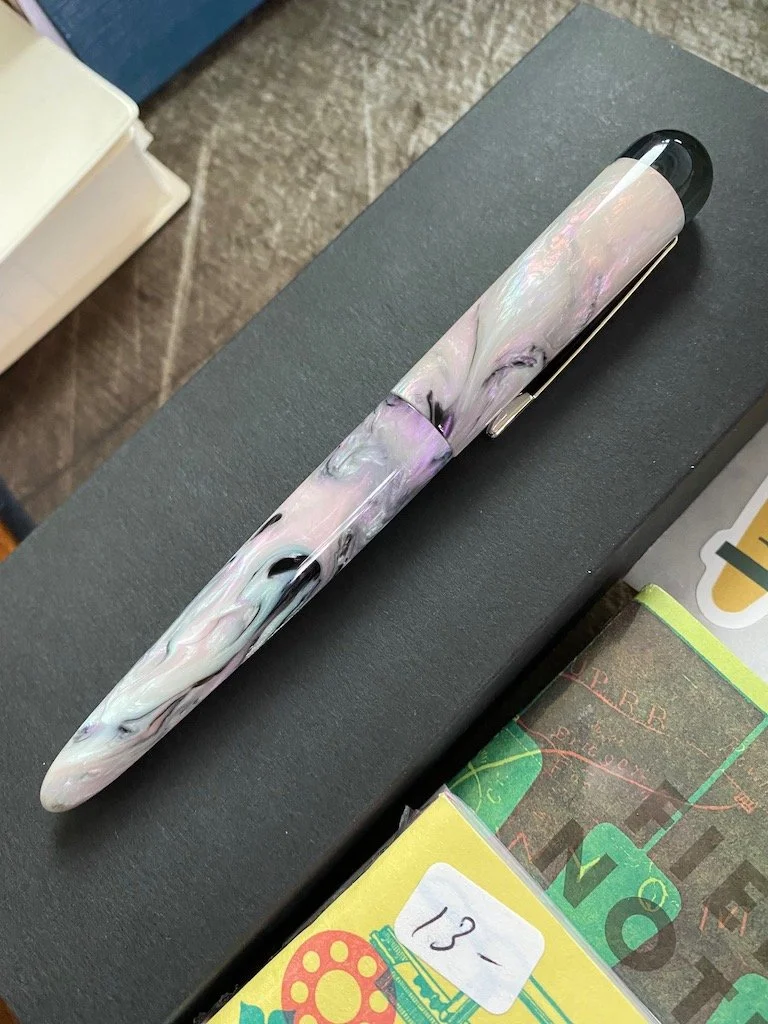 Then I had to go take a closer look at the Edison Pens table, because I'd seen their Instagram video of their new model--the Comet--and I was intrigued. And sure enough, they had one so perfect it looked like it was made for me. It's made of Jonathan Brooks' Abalone resin material, which I have drooled over for years, and it has a smokey clear comet finial. It had to be mine! I got a broad nib on it, as the pen colors practically insist that it be filled with pale shell-colored inks.