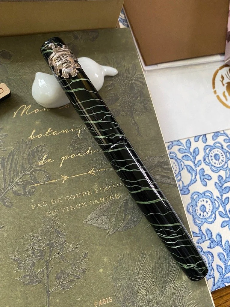 You know Sarj's table? The most dangerous corner in any pen show? I have successfully resisted the overwhelming temptation of that table for years, since 2016. But for the last few shows, I've been tempted by the same pen, and every year, I walk away thinking I'm safe. And every year it's still there. But it won't be there next year, because reader, it's mine now. A John Twiss vintage celluloid pen in black with lightning vines of bright green twisting around the material, with a silver green man roll-stop. It's so lovely. And it's my first celluloid pen. It also consumed the entire rest of my budget. I decided to end my day there, and I practically floated out of the ballroom.