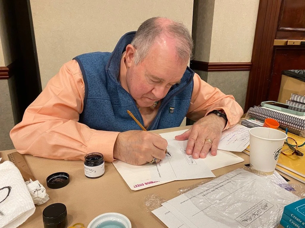 Sunday was much slower at the show. There was less crowd, which meant more time to chat with a few folks who had been too busy the day before. I was also determined to find the aforementioned gifts this time. I mentioned my quest to Hugh from Kanilea, and he walked me down to Michael Sull's table, where he and Al had tons of lovely paper. Michael even took the precious last few minutes of his time before a day of classes to write my mother-in-law's name and beautifully embellished it. She's going to love that. Then Al showed me all the papers, and I picked out some watercolor paper I know she'll love.