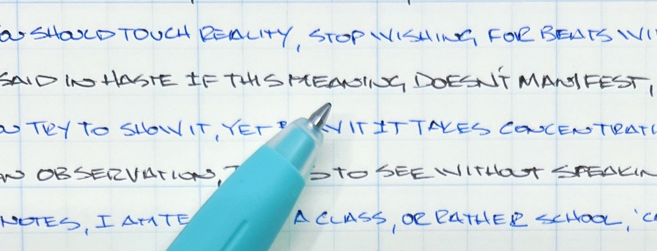 If the refills were brilliant (notice the Black and Red refills didn’t make the pros list above - they are much drier than the Blue,) I would get used to the weird knock style and layout. And the barrel is nice to hold and use. But I can’t get there when I have other great options available to me an arms reach away.