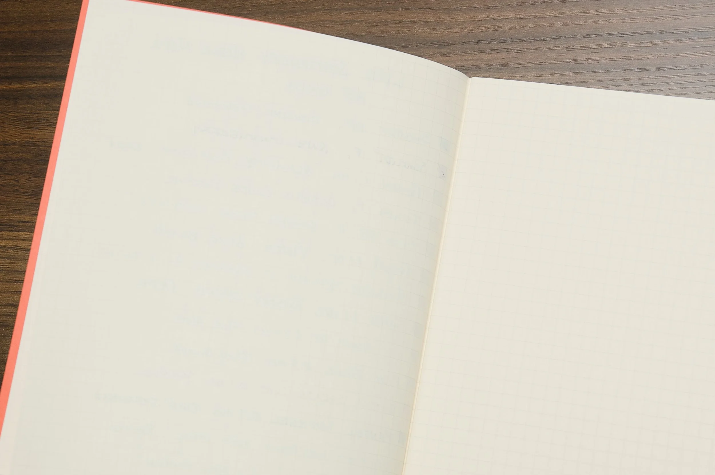 The 84.9 gsm paper is a joy to use. I'm not a huge fan of ivory paper — I prefer white paper — but it's easy to look past that preference in this case. The paper doesn't feel thick, but it performs like thicker paper. I haven't noticed any adverse behaviors like feathering, bleeding, or skipping when writing in these notebooks. There's a bit of ghosting or show-through on the back of the page, but not enough to prevent you from writing on both sides of the sheet. When writing, the feel of the paper through the pen tip is smooth with subtle feedback that lets you easily control the pen. A little bit of texture in paper goes a long way, and these notebooks nailed the balance of smoothness and texture for great writing feel.