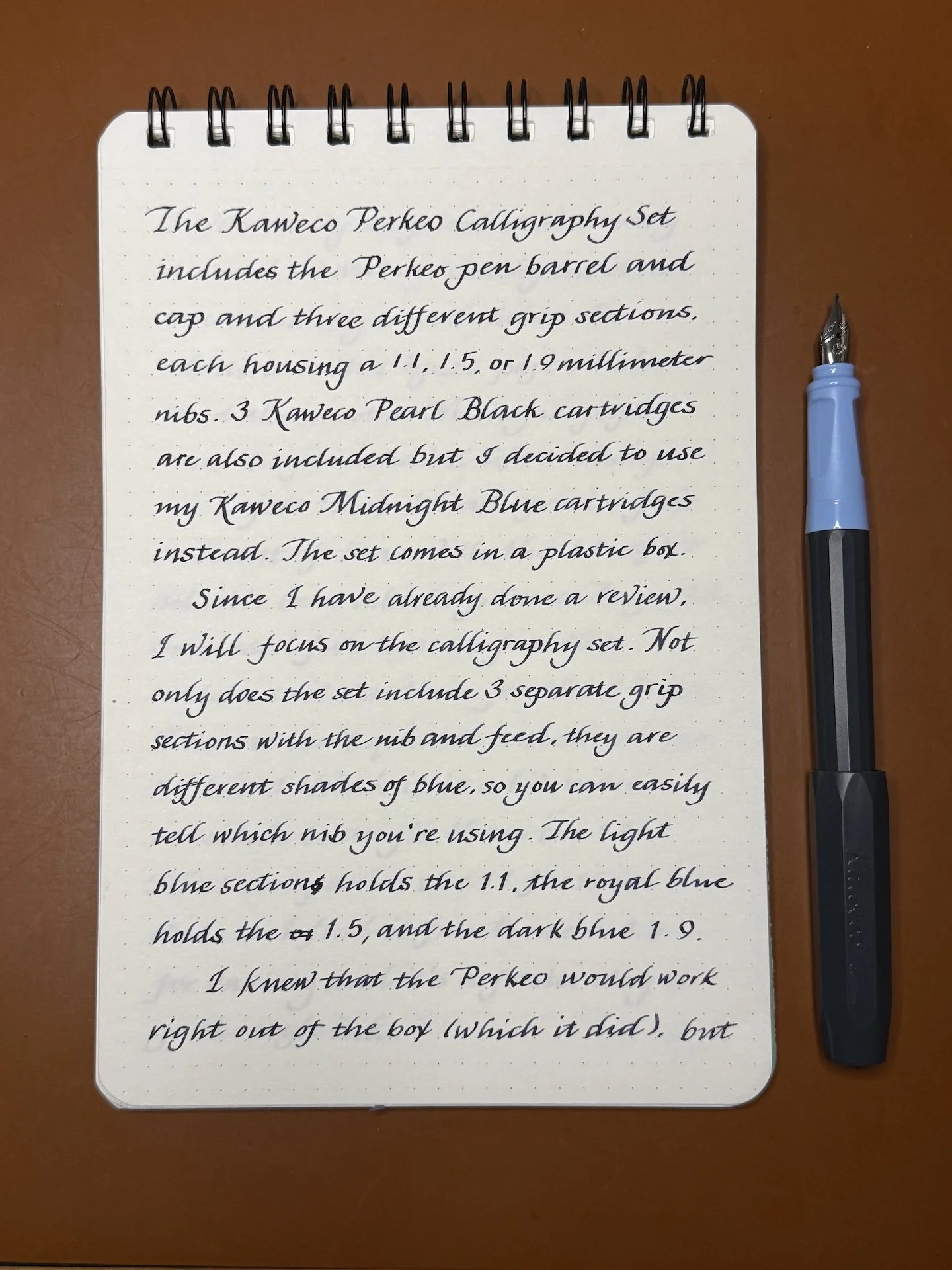 The Kaweco Perkeo Calligraphy Set includes the Perkeo pen barrel and cap and three different grip sections, each housing 1.1, 1.5, or 1.9 millimeter nibs. 3 Kaweco Pearl Black cartridges are also included but I decided to use my Kaweco Midnight Blue cartridges instead. The set comes in a plastic box.
