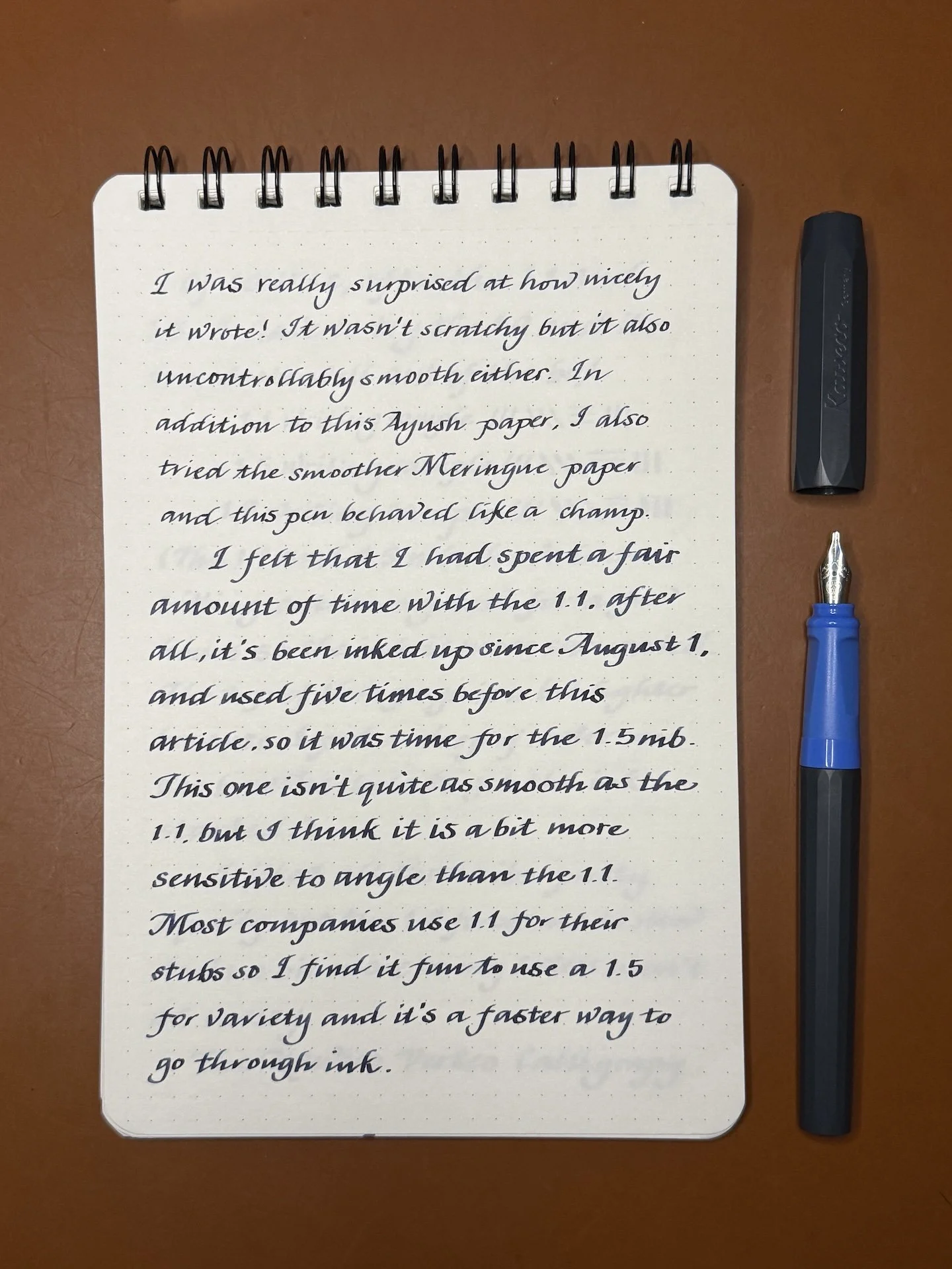I felt that I had spent a fair amount of time with the 1.1; after all, it’s been inked up since August 1, and used five times before this article, so it was time for the 1.5 nib. This one isn’t quite as smooth as the 1.1, but I think it is a bit more sensitive to angle than the 1.1. Most companies use 1.1 for their stubs so I find it fun to use a 1.5 for variety, and it’s a faster way to go through ink.