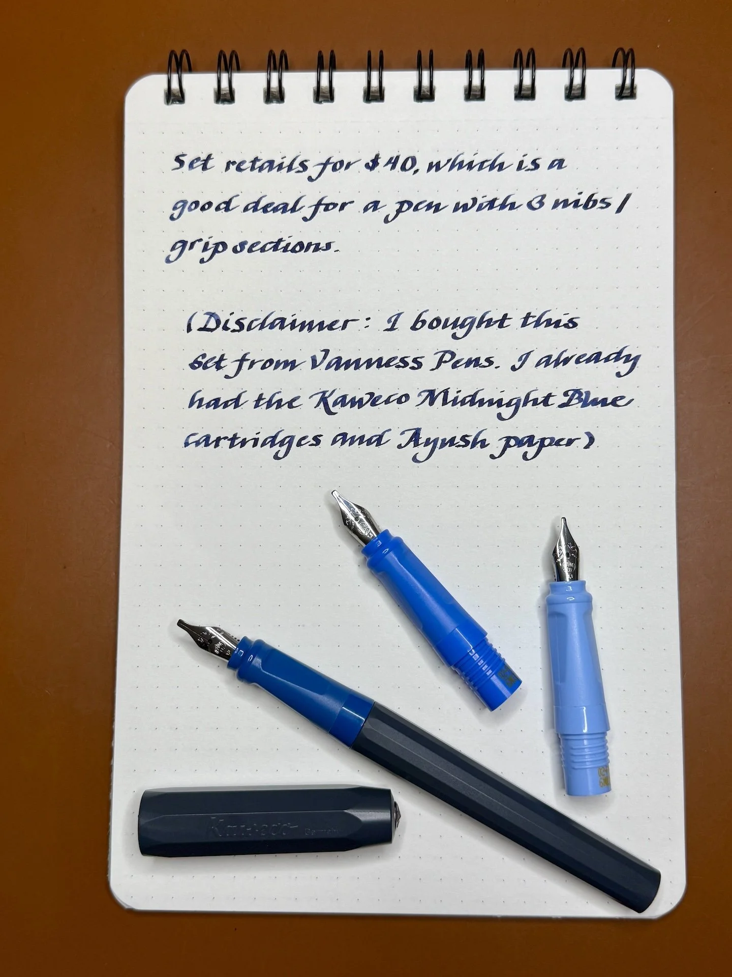 (Disclaimer: I bought this set from Vanness Pens. I already had the Kaweco Midnight Blue cartridges and Ayush Paper.)