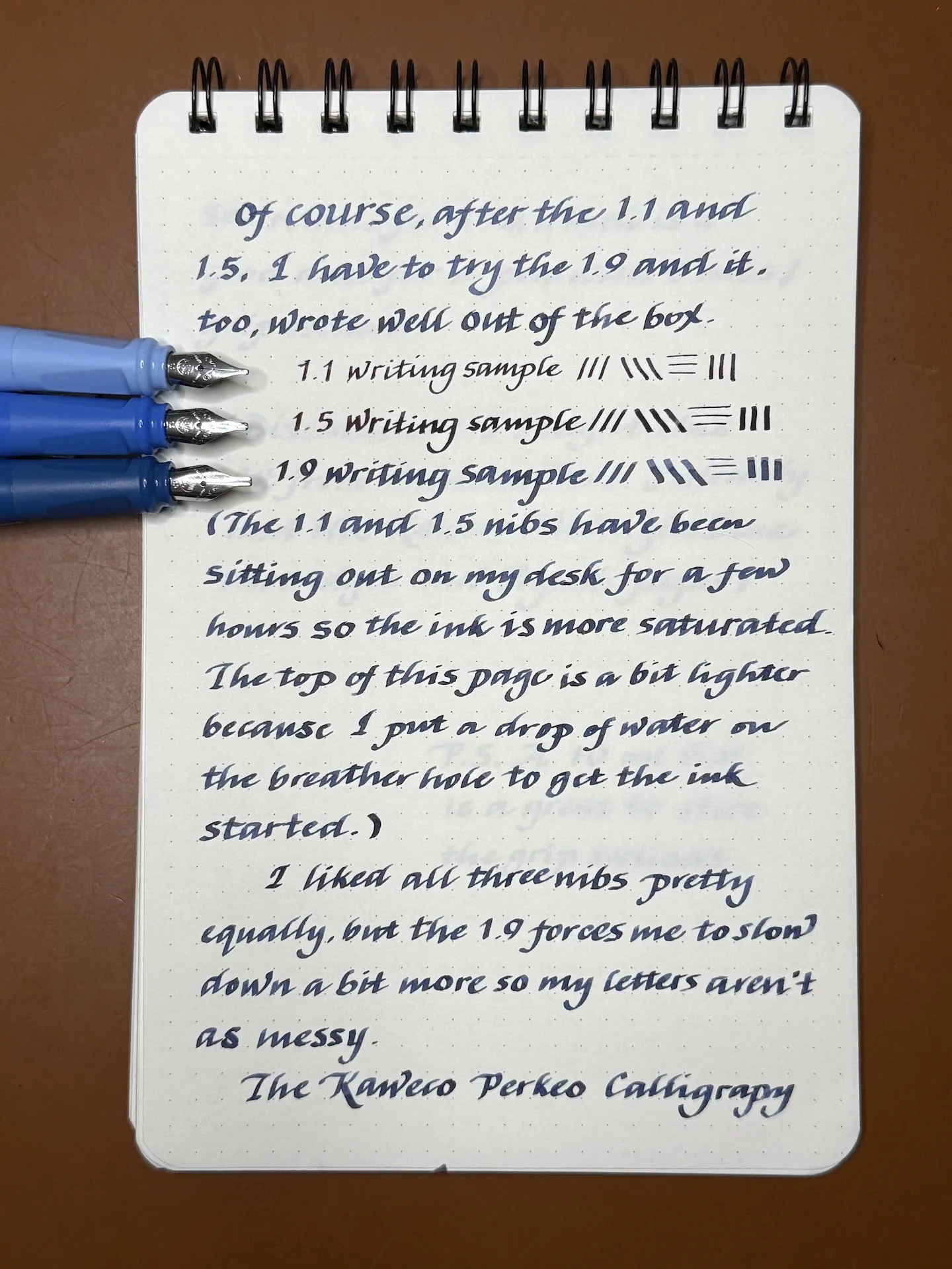 Of course, after the 1.1 and 1.5, I have to try the 1.9 and it, too, wrote well out of the box. (The 1.1 and 1.5 nibs have been sitting out on my desk for a few hours so the ink is more saturated. The top of this page is a bit lighter because I put a drop of water on the breather hole to get the ink started.)