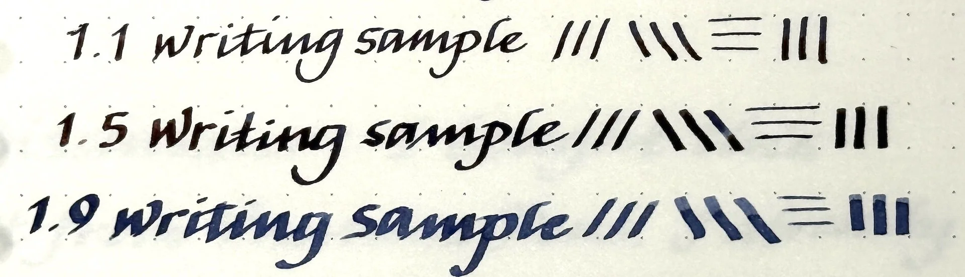 Writing sample of the 1.1, 1.5, and 1.9 nibs.