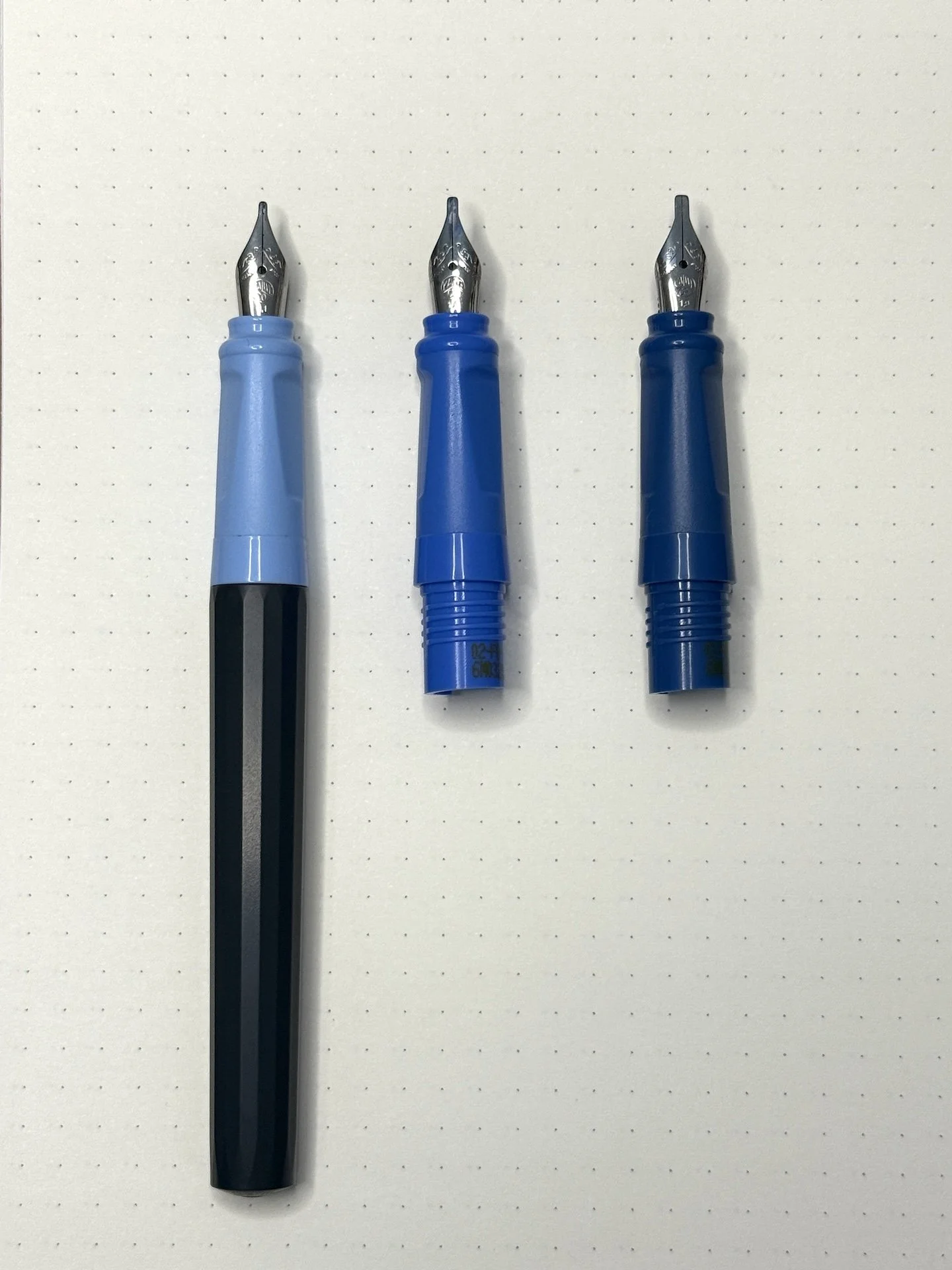 The light blue 1.1 section (left) is installed in the pen, 1.5 royal blue in the middle, and 1.9 dark blue on the right.