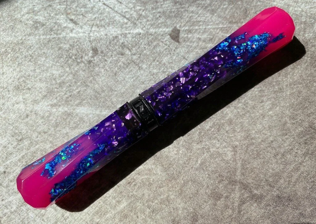 The Scepter pens are shaped acrylic, with swirling facets around the pen that end in twin flared, gem-shaped ends. It's an odd shape, and doesn't look terribly comfortable, but it is surprisingly nice to hold. The flared end balances the section nicely, and the wider part rests against the hand. The grip section, which is plain black, is quite narrow, adding to its somewhat odd silhouette, but it is also a comfortable fit for me. The slightly tapered end of the grip prevents slipping too far, and the step-up to the threads and body is far back enough that it doesn't interfere with the hold at all.