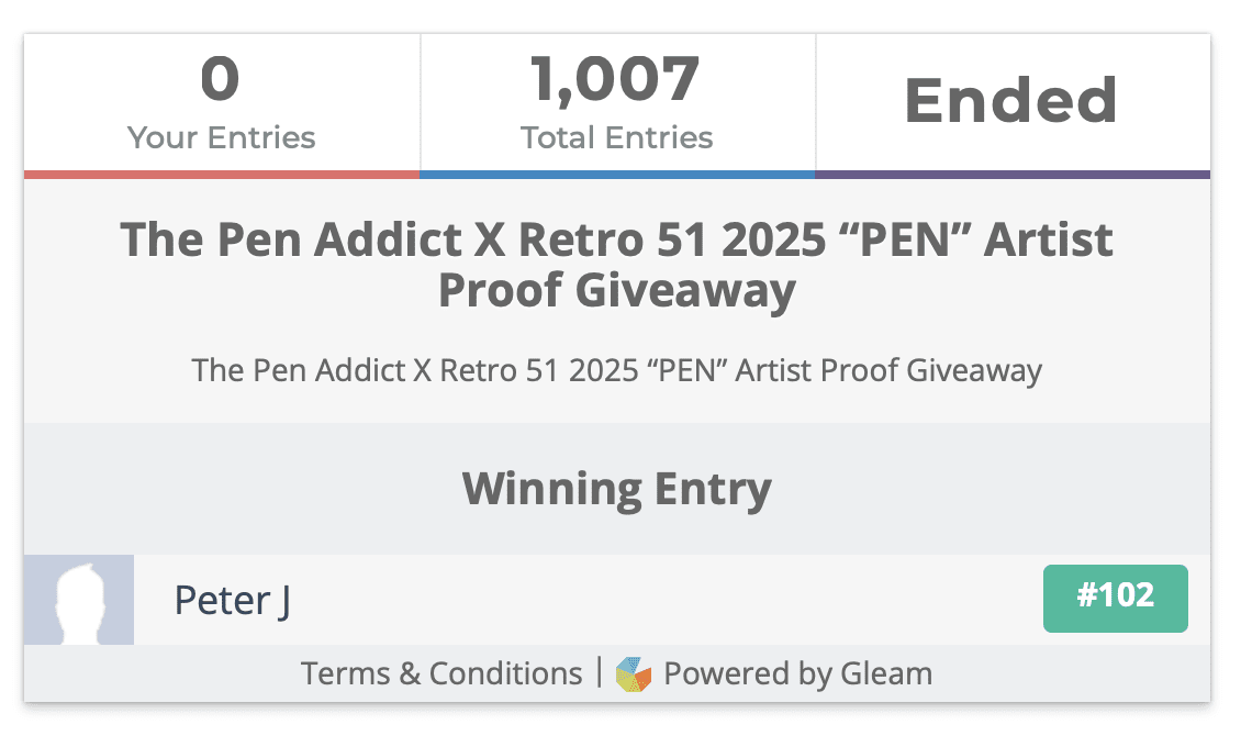 One of the fun surprises when you work with Retro 51 on a pen design is getting a few extra Artist Proof models to test with. I have an unopened “P” model of my latest release, the The Pen Addict X Retro 51 2025 “PEN”, to give away this week, which is a fun addition to any collection. And the winner is: