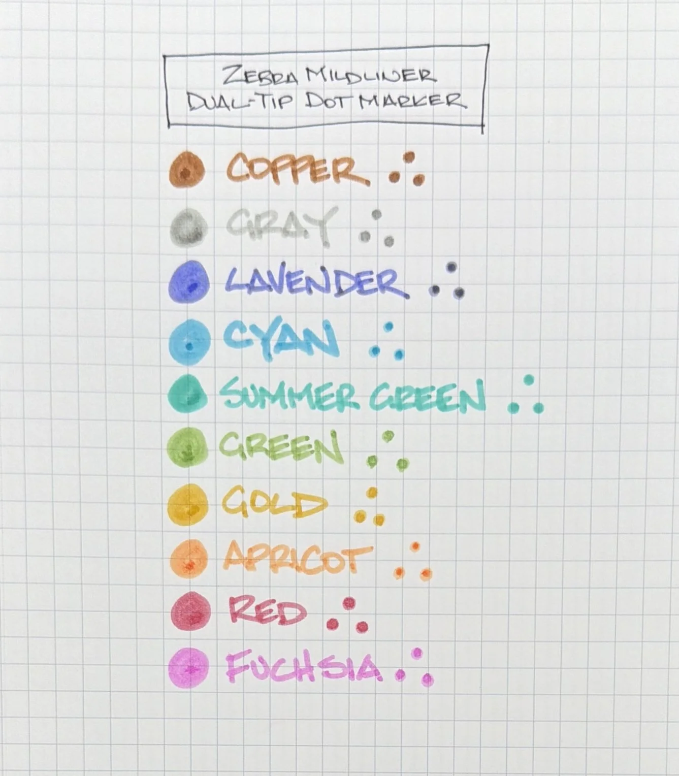 I bought this set of 10 Dual-tip Dot Markers this Summer from Zebra at the Atlas Stationers Sidewalk sale. I hadn’t seen them before, but apparently I hadn’t been looking hard enough, as they are available in a few pack sizes (2, 5, and this 10,) although not in the massive variety of shades found in the classic chisel-tip Mildliner lineup.