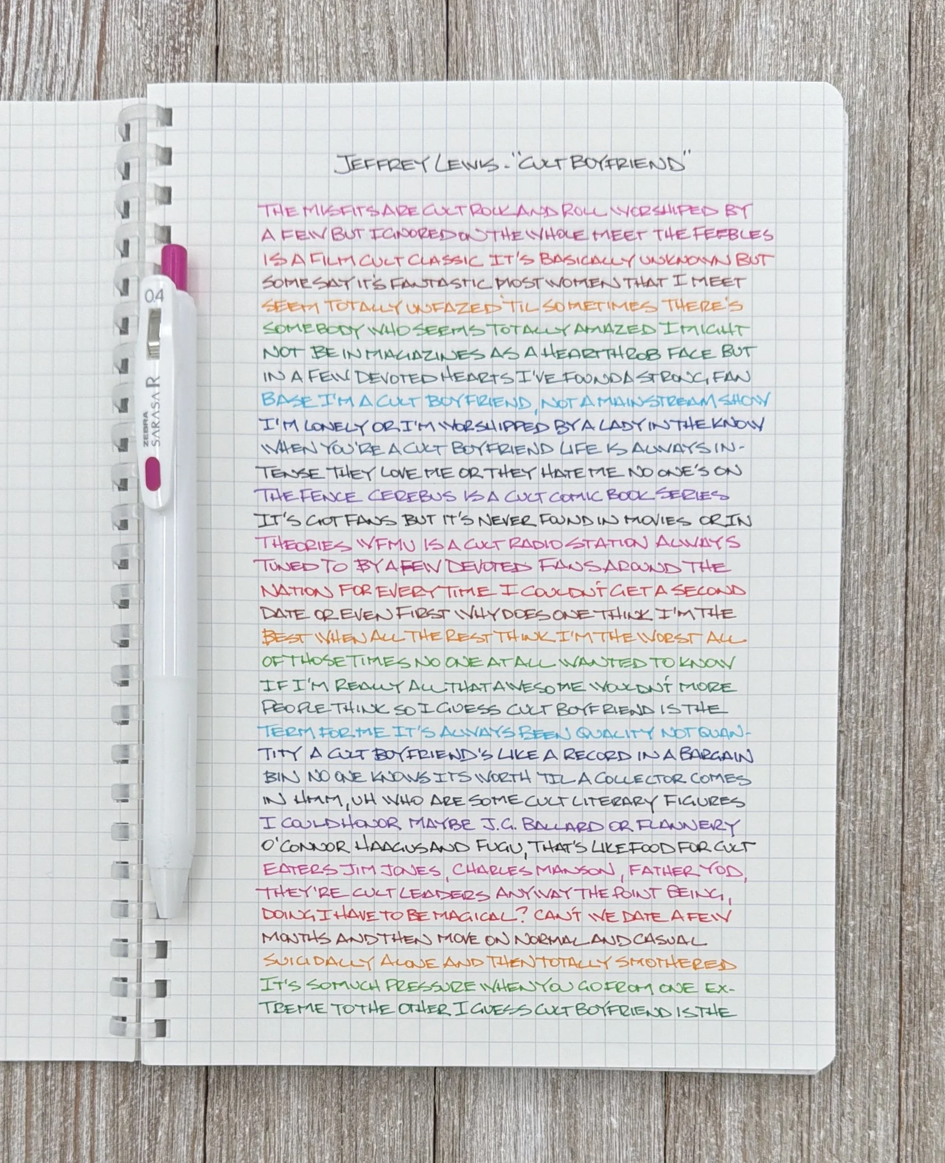 The 0.4 mm Zebra Sarasa R colors pop off the page.