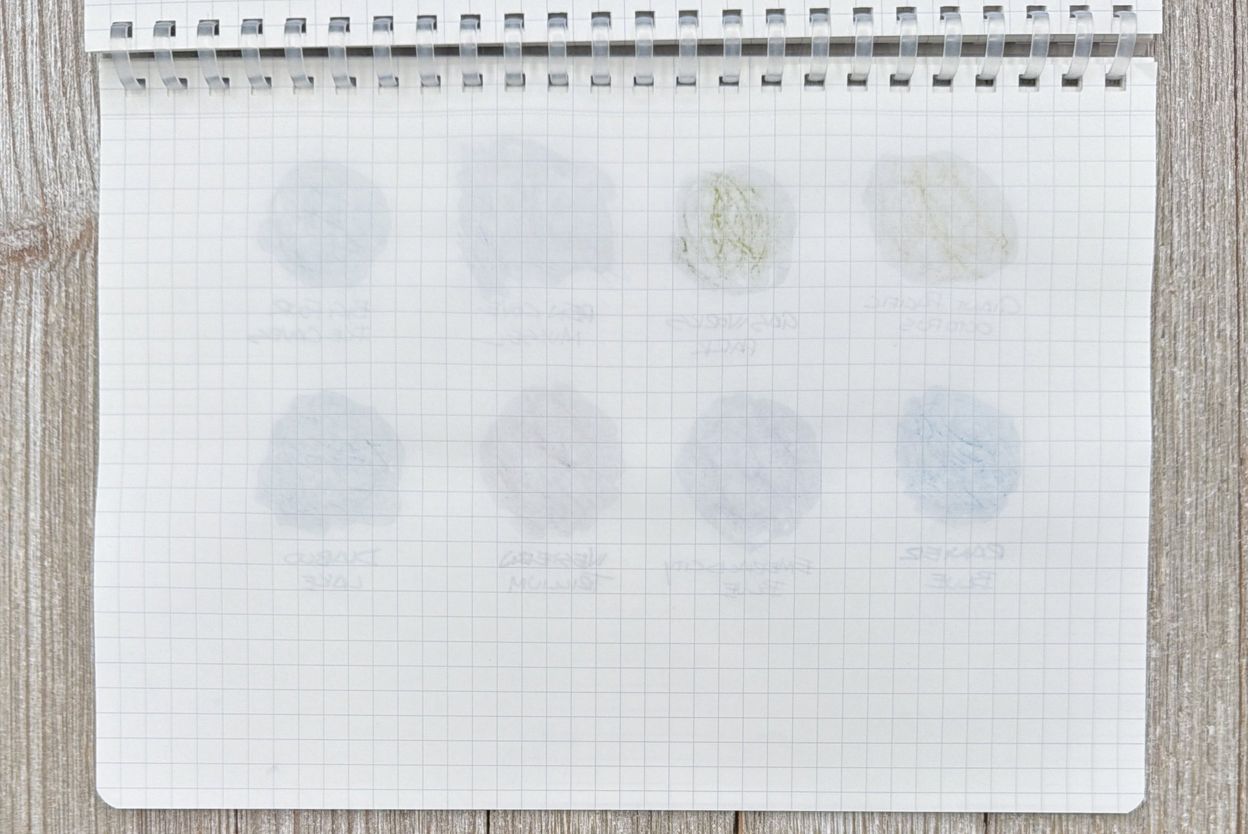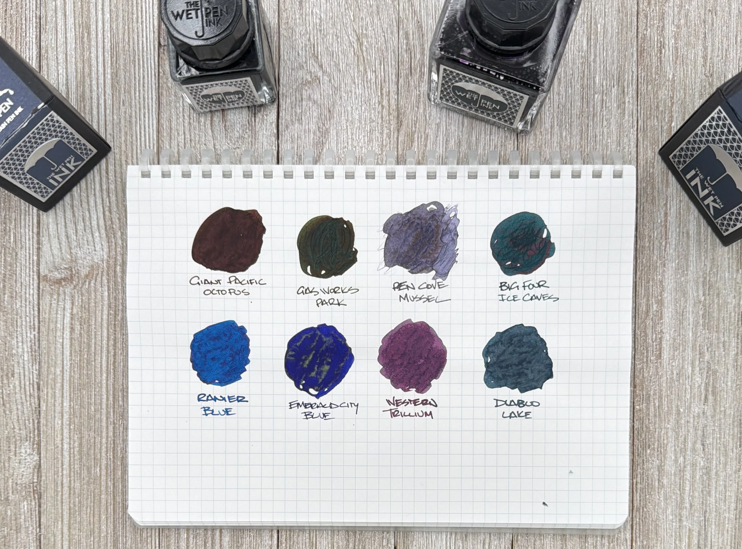 Gas Works Park went through the back, only because I ran a second layer over the top and the steel nib breaks up the page. I even added water to Penn Cove Mussel, which is second from the top left, and nothing went through.