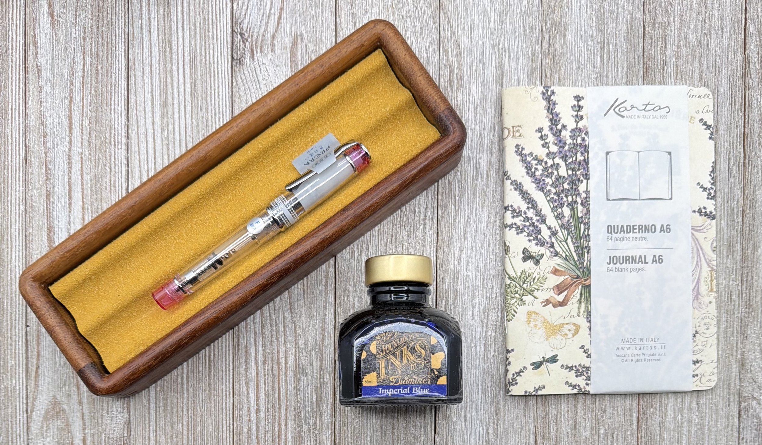 In my browsing at the very end of the day, I stumbled across notebooks. Made in Italy, and theoretically fountain pen friendly. The sadly now-discontinued pocket-sized journal was an easy $7 addition for on-the-go notes to round out the package and take me all the way back around to close the loop!