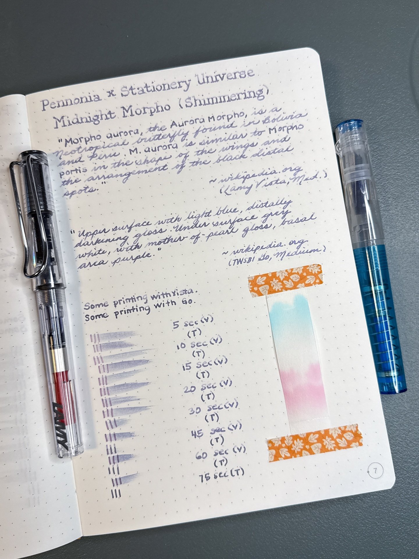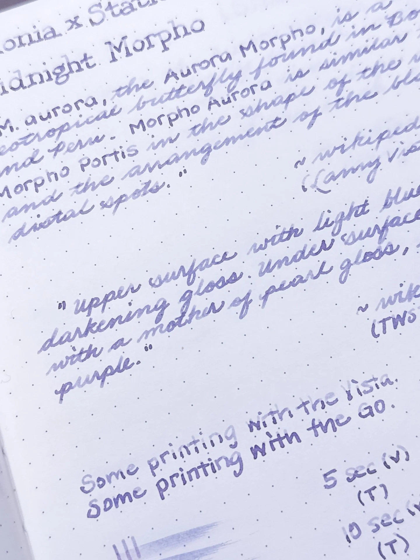 Midnight Morpho is a chroma shading dusty purple ink. In swatches, you can see shades of blues and even pinks, especially when more ink is laid down. Compared to Morning Morpho, Midnight Morpho is a bit drier, which is common amongst chroma-shading inks. I wouldn’t say that it was too dry in the Lamy Vista, but it flowed better from the TWSBI Go. There was no sheen from either pen, and dried slightly faster than Morning Morpho (average to fast dry times).