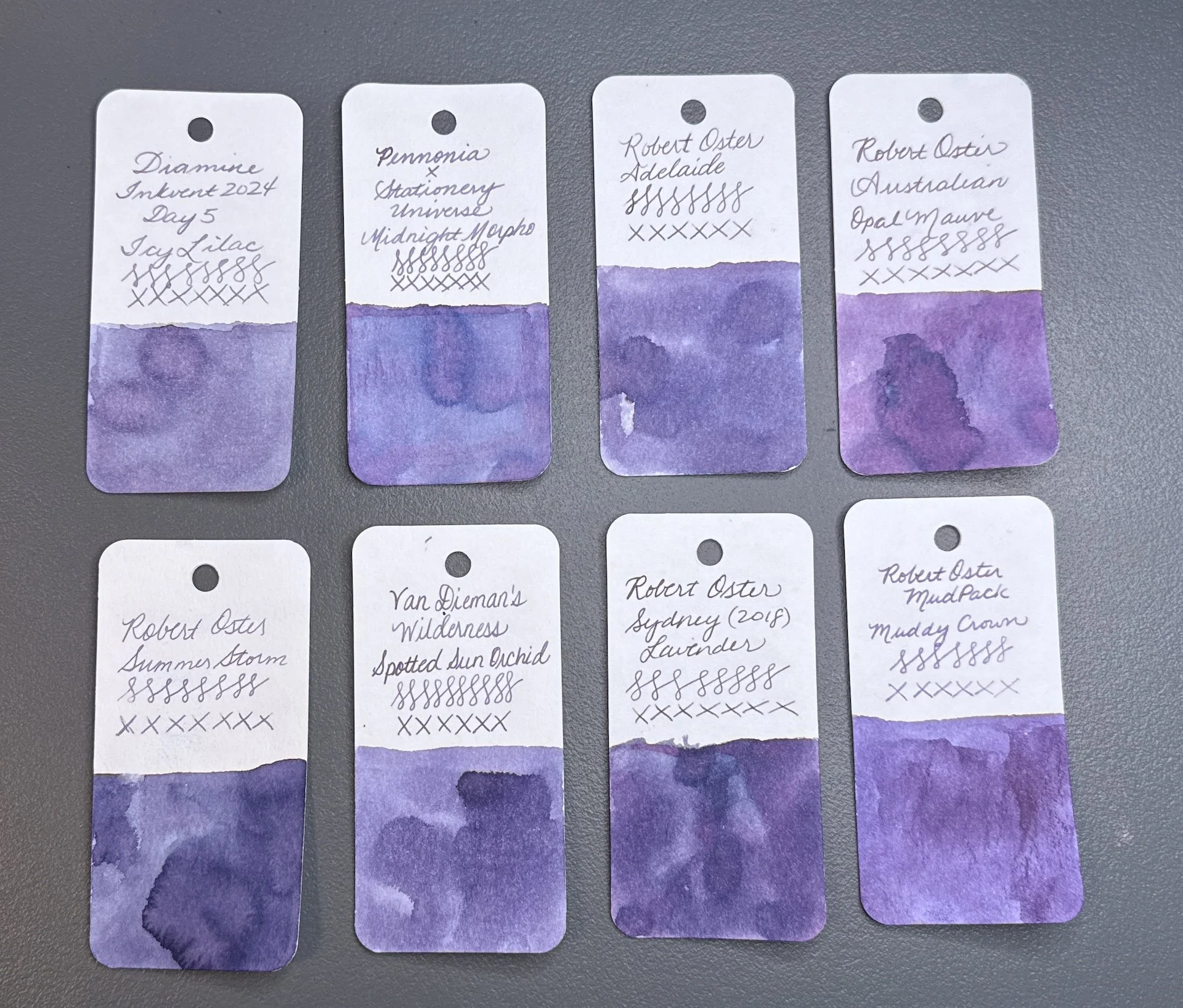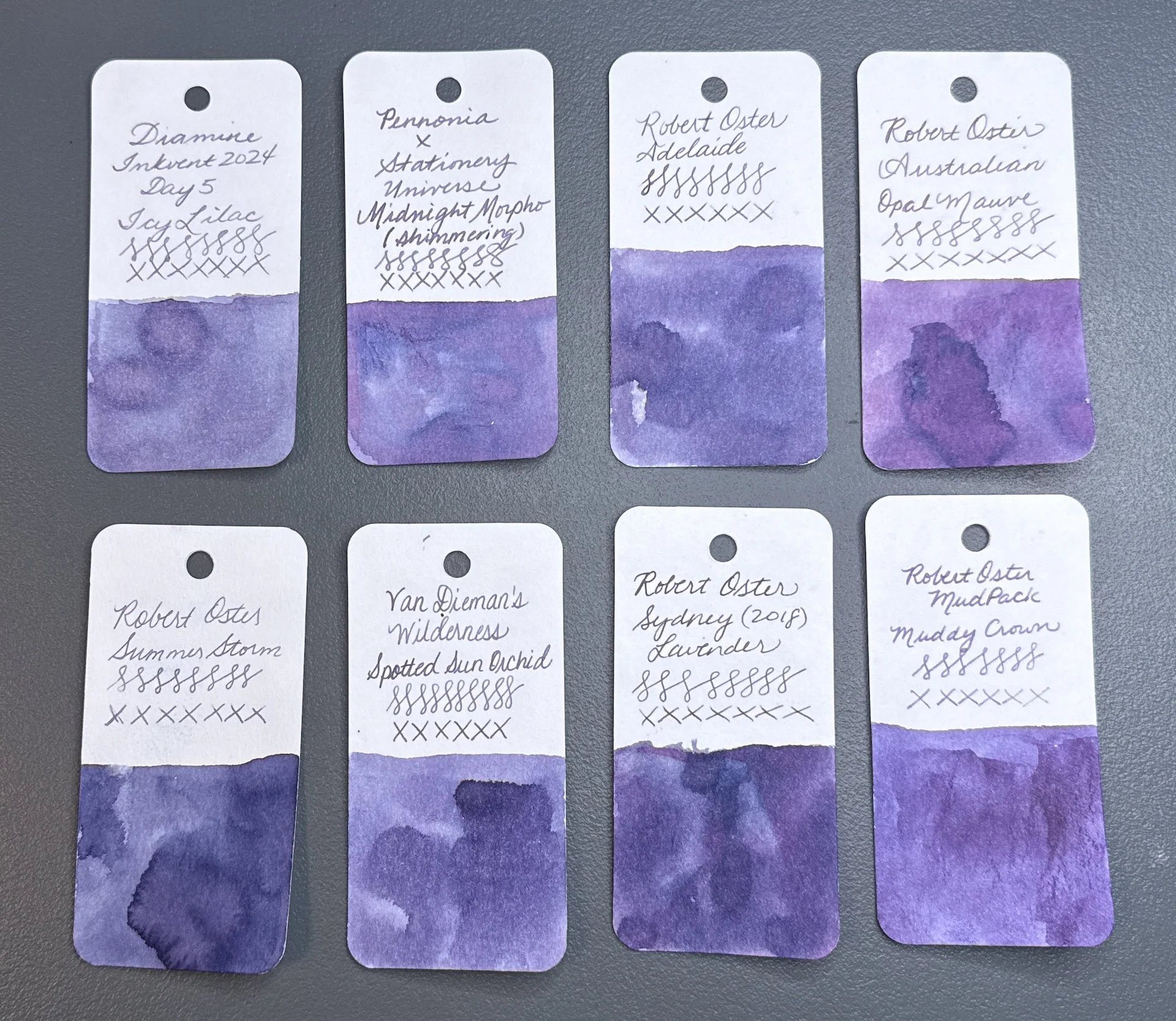 Inks similar to Midnight Morpho: Diamine Icy Lilac (from Inkvent 2024), Robert Oster Adelaide, Robert Oster Australian Opal Mauve (too red), Robert Oster Summer Storm, Van Dieman’s Spotted Sun Orchid, Robert Oster Sydney Lavender, Robert Oster Muddy Crown. Most of these didn’t have the touch of blue that Midnight Morpho has - Icy Lilac is probably the closest.