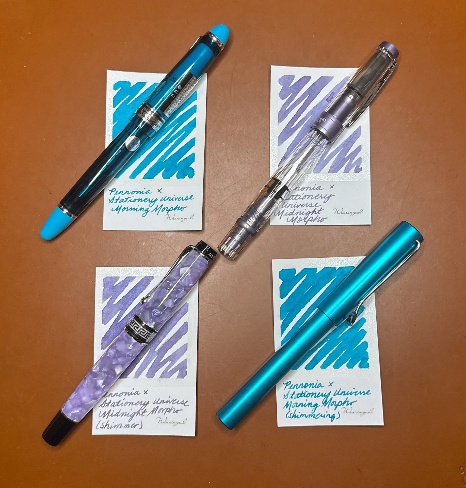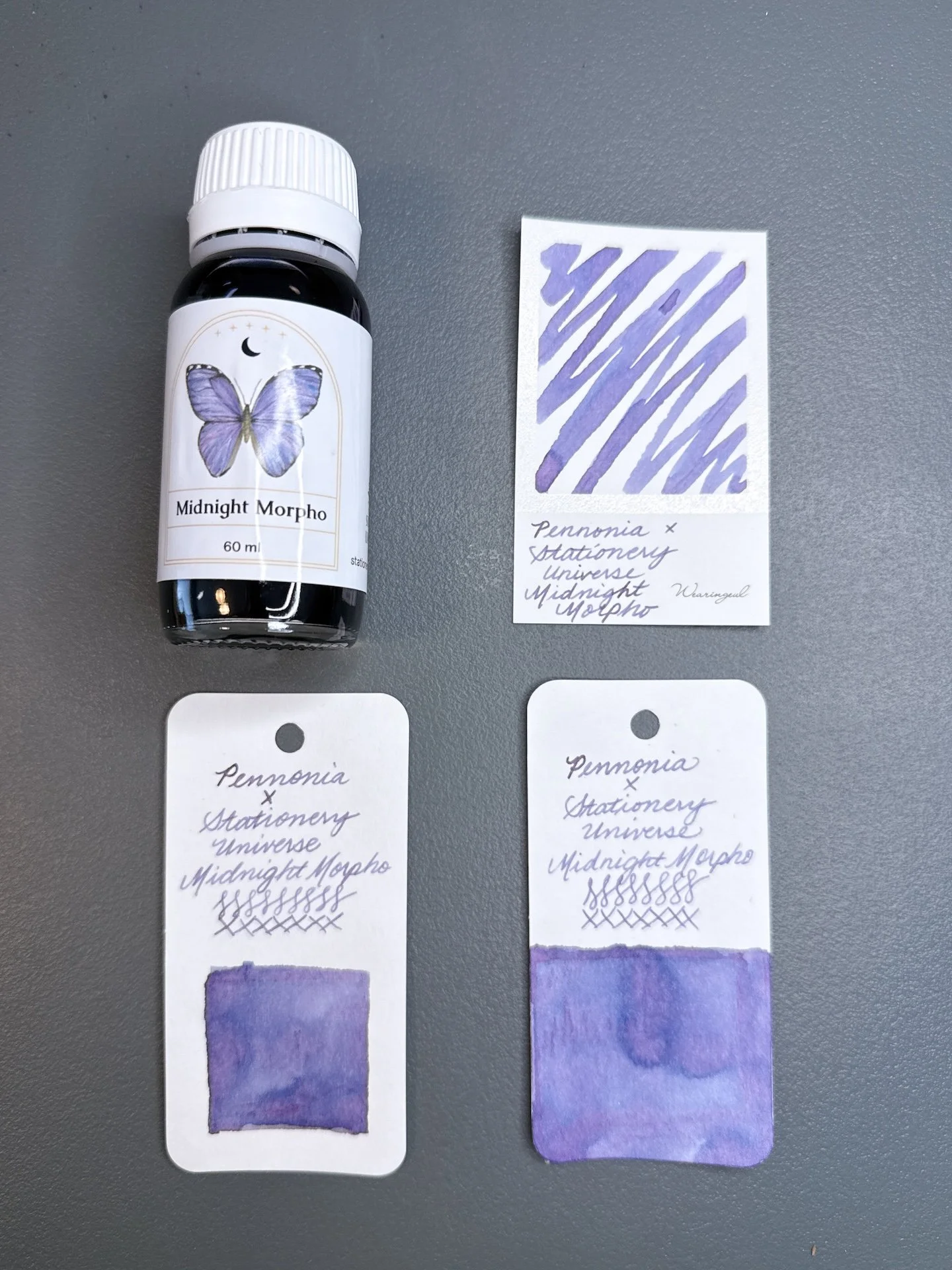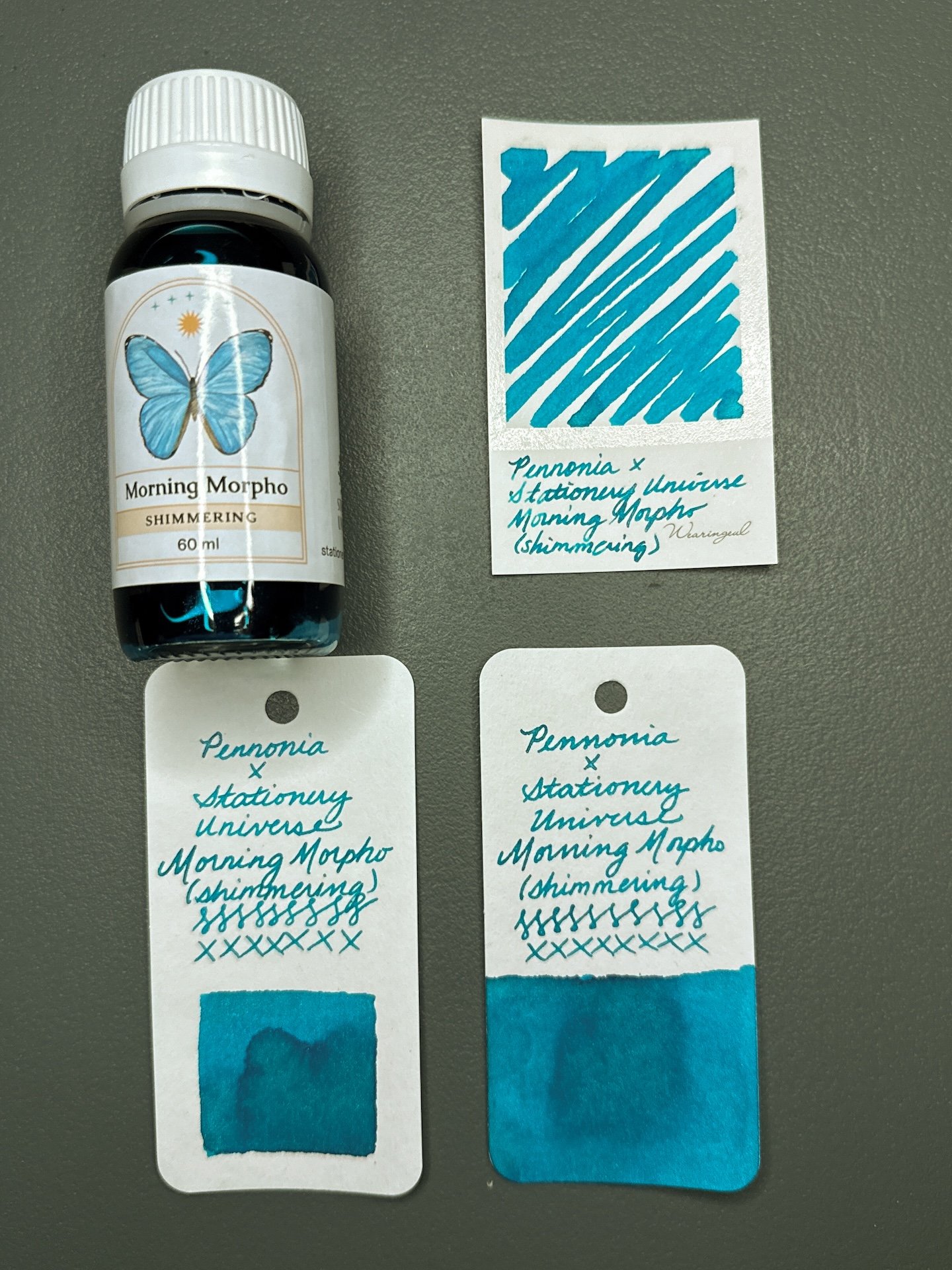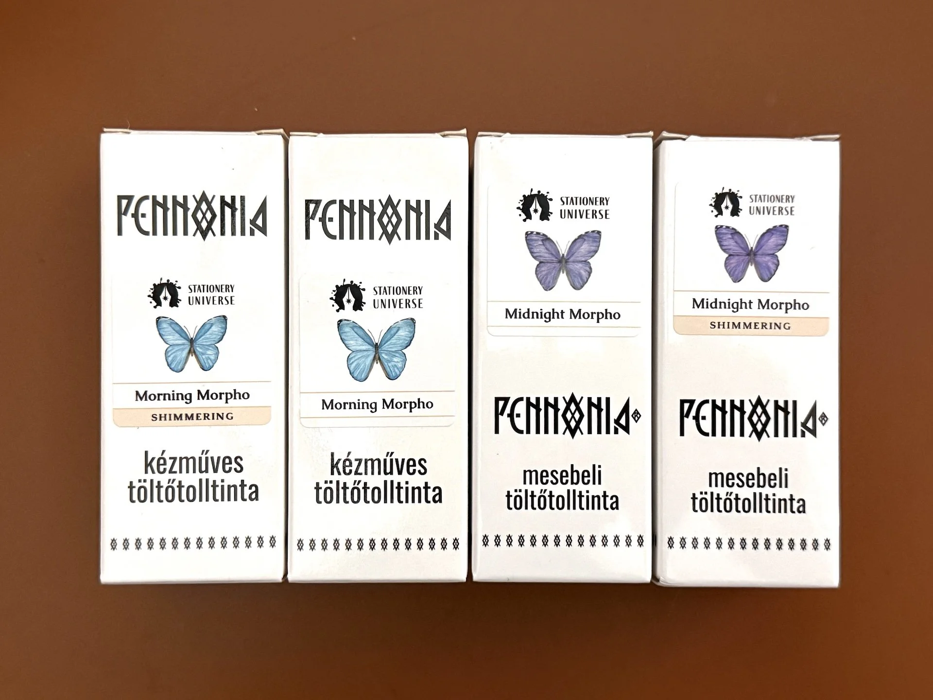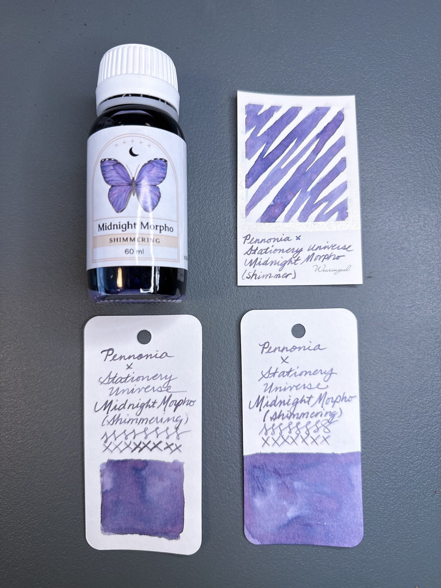 The 60 ml ink bottles of the Stationery Universe Morpho Collection cost $20/bottle for non-shimmer and $22 with shimmer.