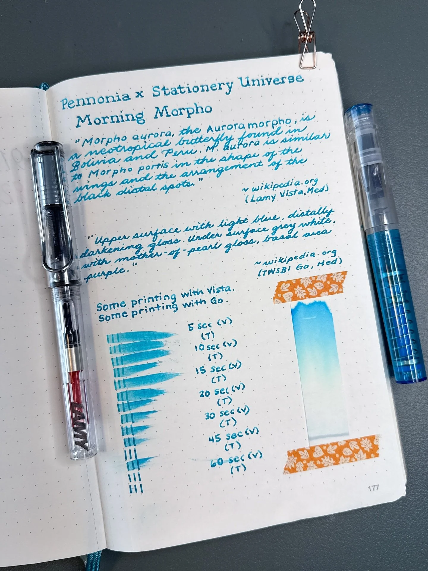 You can see the Morning Morpho’s shading, as well as its more turquoise color, from the Vista (top) versus a more saturated writing sample from the Go.