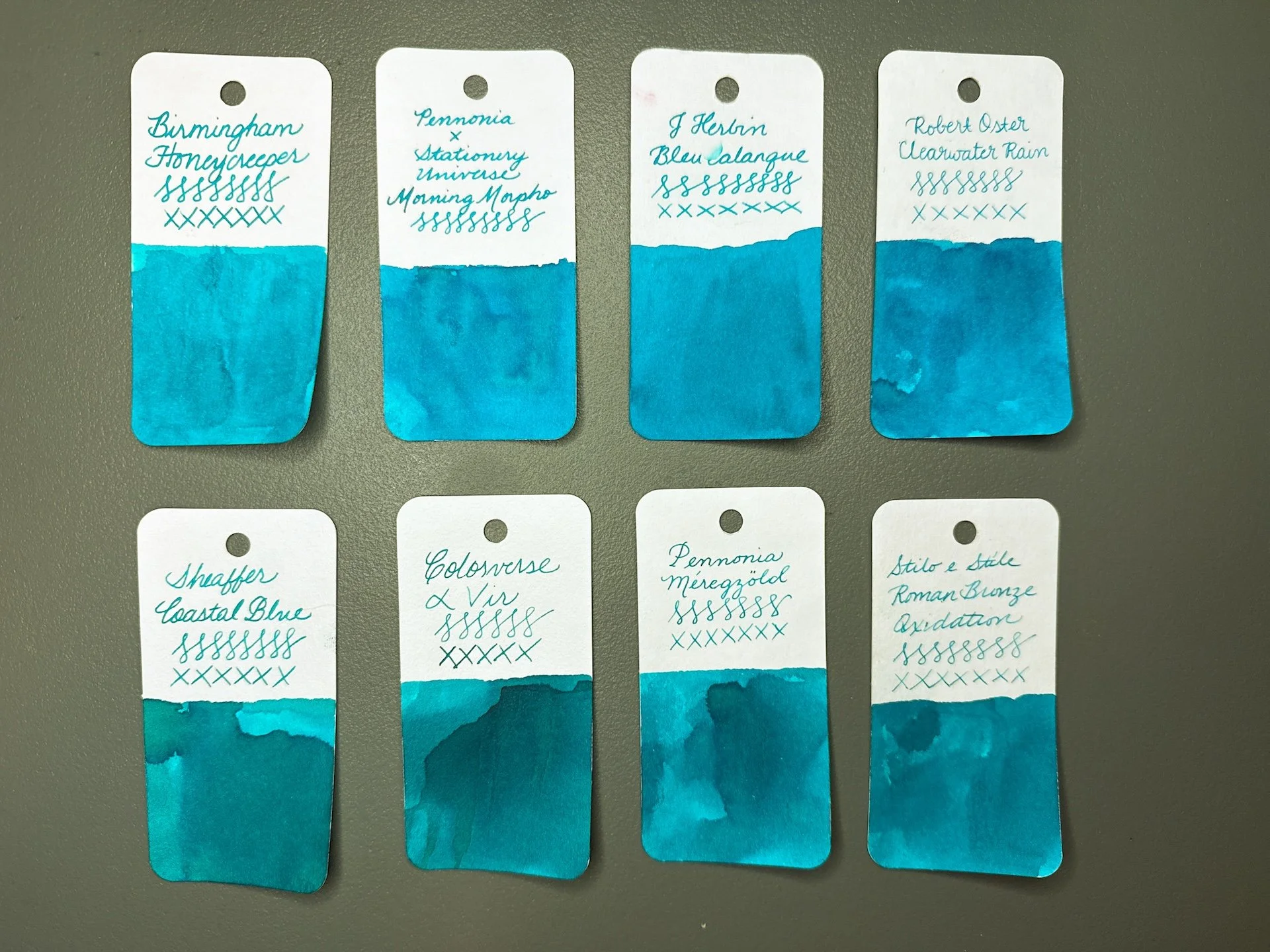 Inks similar to Morning Morpho: Birmingham Honeycreeper (a bit too too blue, too bright), J Herbin Bleu Calanque and Robert Oster Clearwater Rain are probably the closest, but needs a touch more green), Sheaffer Coastal Blue, Colorverse a Vir, Pennonia Meregzold, and Stilo e Stile Roman Bronze Oxidation lean too green (but are closer when viewed irl).