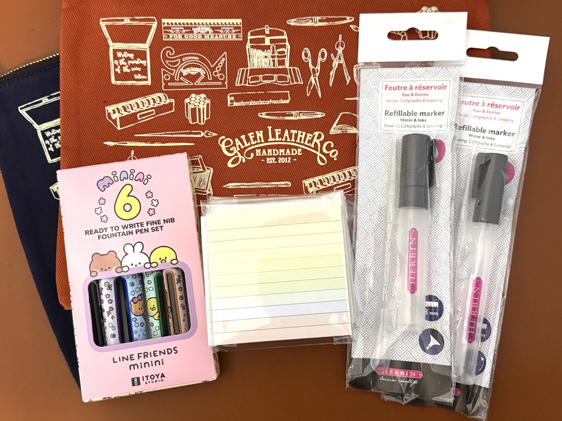 Two A5 zipper pouches from Galen Leather, Minini fountain pens from Itoya Studio, special RainbowRule ™ Post-It ® notes designed by Jenn Smith (yes, they are actually Post-It ®), and two Herbin refillable markers from Lemur Ink that I can’t WAIT to try with fountain pen ink.