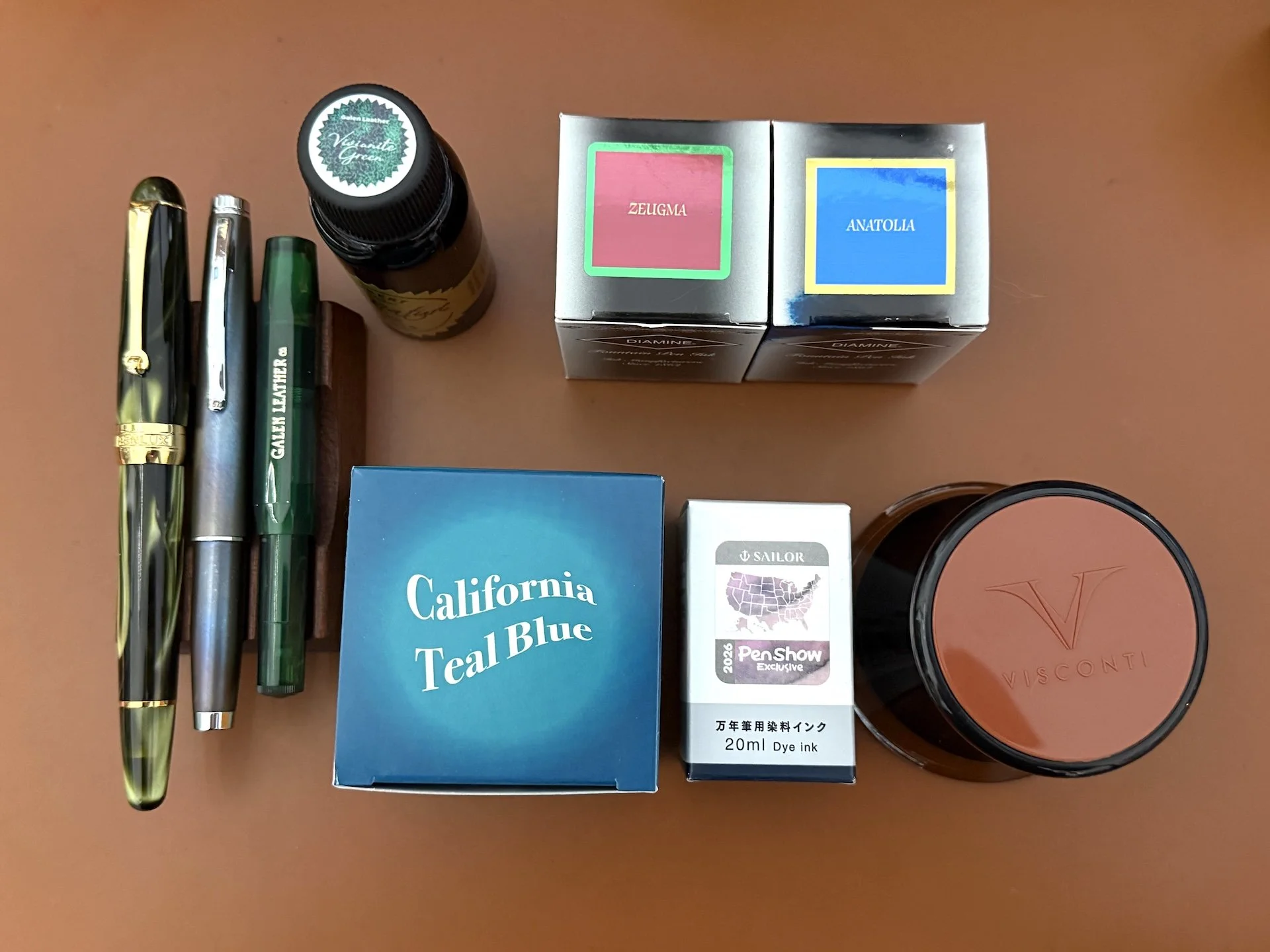 Pens: Penlux Delgado Moss, Monteverde Dakota Raw Flame, Kaweco Sport, Galen Leather exclusive Vivianite. Inks: Robert Oster x Galen Leather Vivianite, Diamine x Galen Leather Zeugma and Anatolia, Nagasawa/Kobe x CA Pen Show California Teal Blue, Sailor 2026 Pen Show Exclusive, and Visconti Sepia.