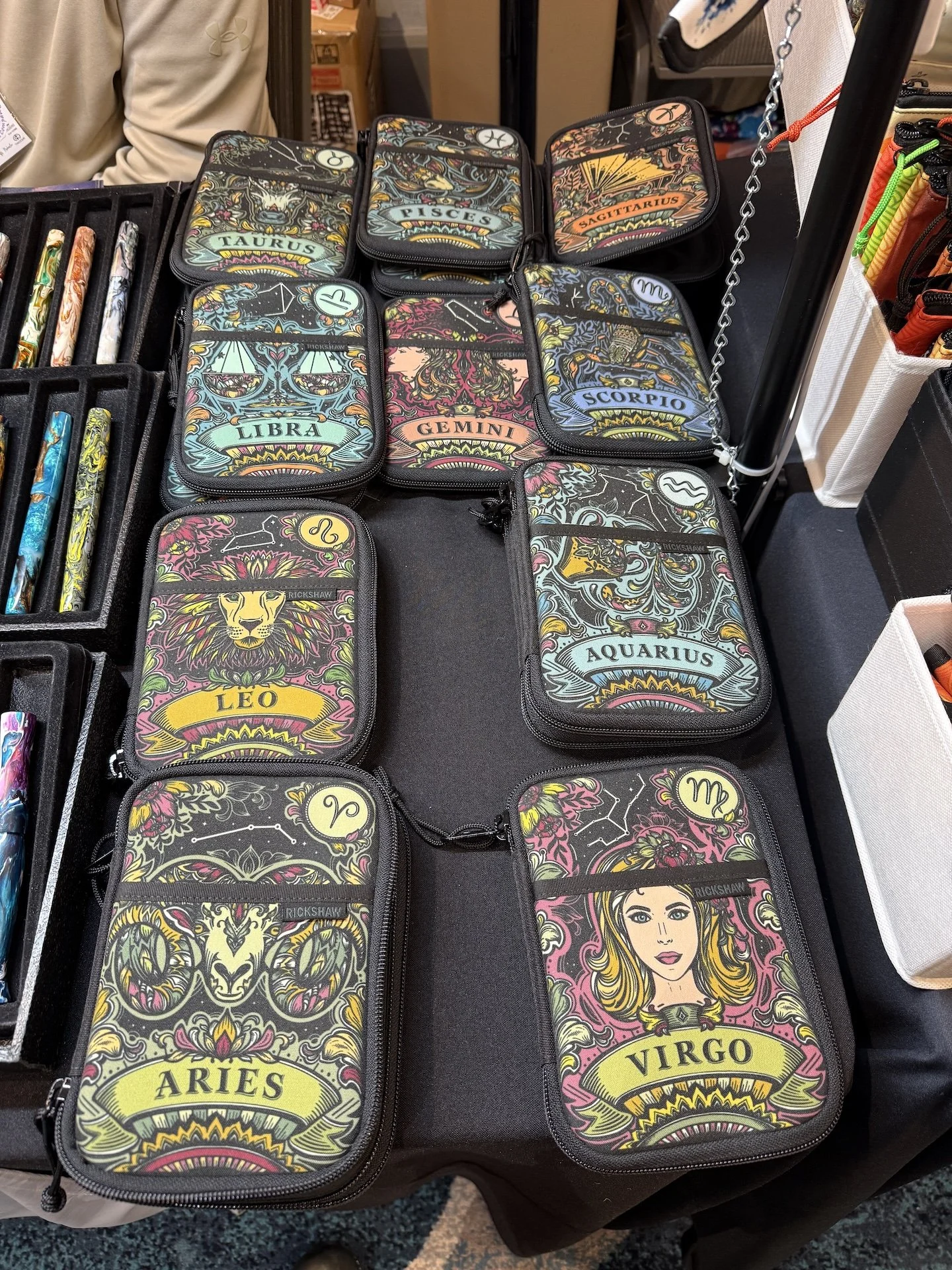 New Rickshaw Fillmore cases in new Zodiac designs at the Zodiac Pen Co table.