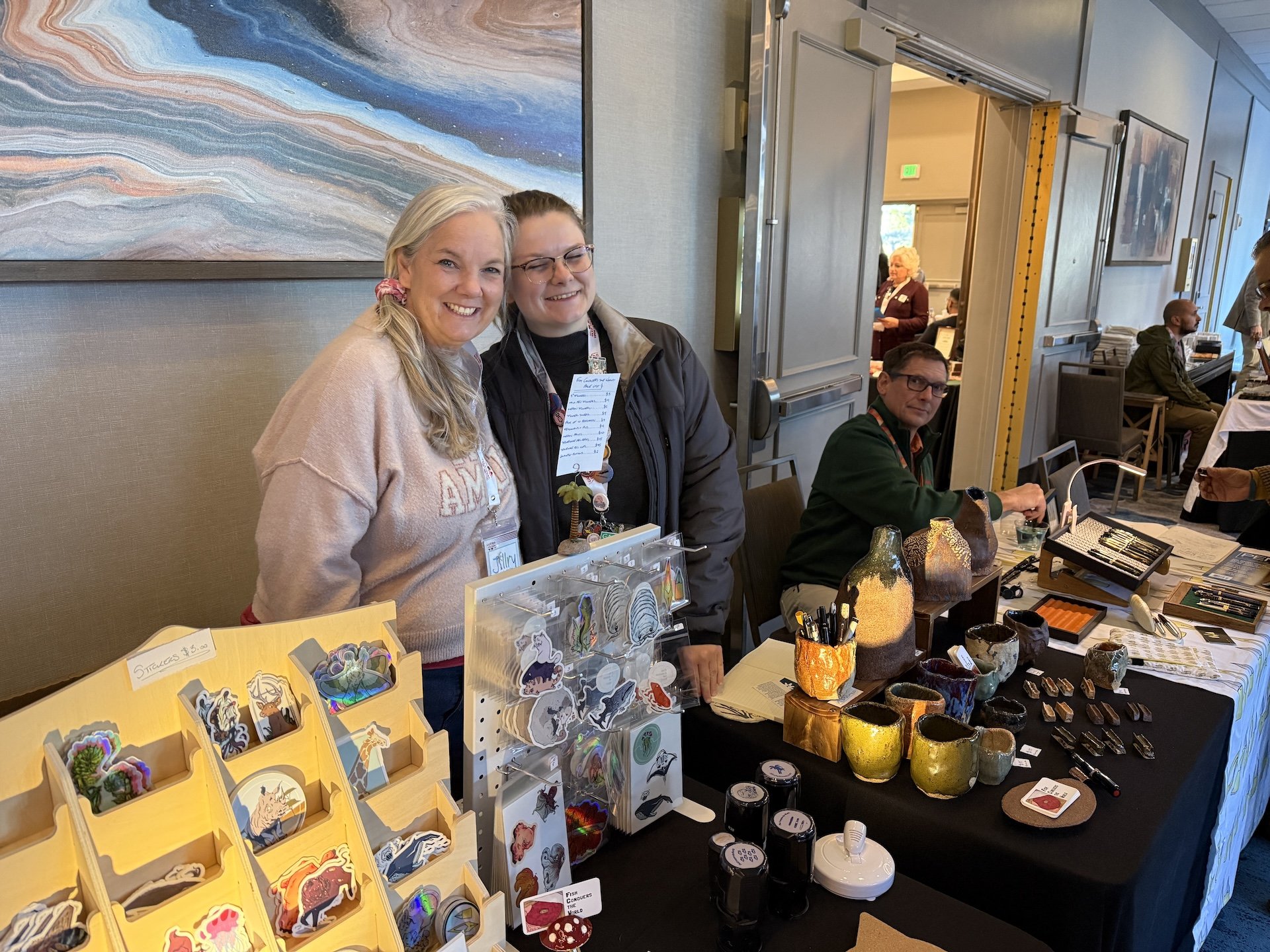 Jill, Faith, and Stacy Hills are such nice people who have pen cases, stickers, pottery, and vintage pens.