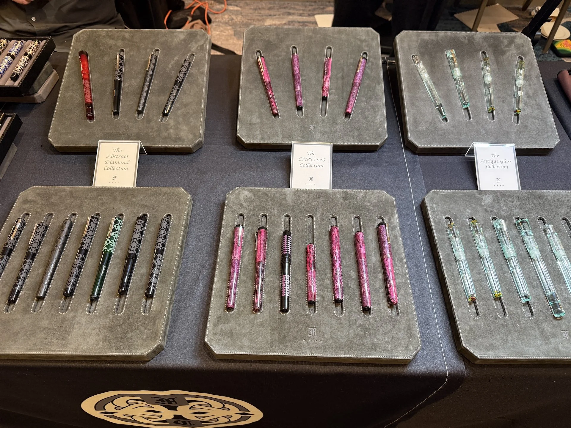 Artisan engraved/painted pens on the left, special CAPS 2026 collection in the center, and the Antique Glass collection on the right.
