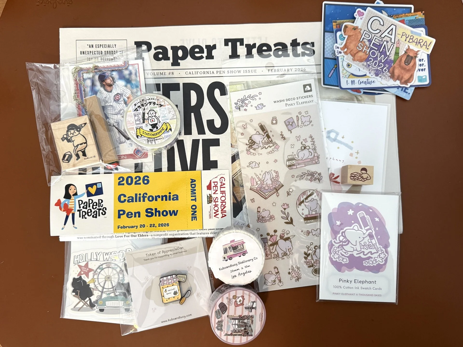 ”News”, RiraRiraHanko baseball stamps (and card) and washi, and “show ticket” from PaperTreats, stickers and washi tape from Kuboandlucy Stationery Co, sticker sheet, swatch card, and stamp from Pinky Elephant, and stickers from Sugar Turtle Studio.