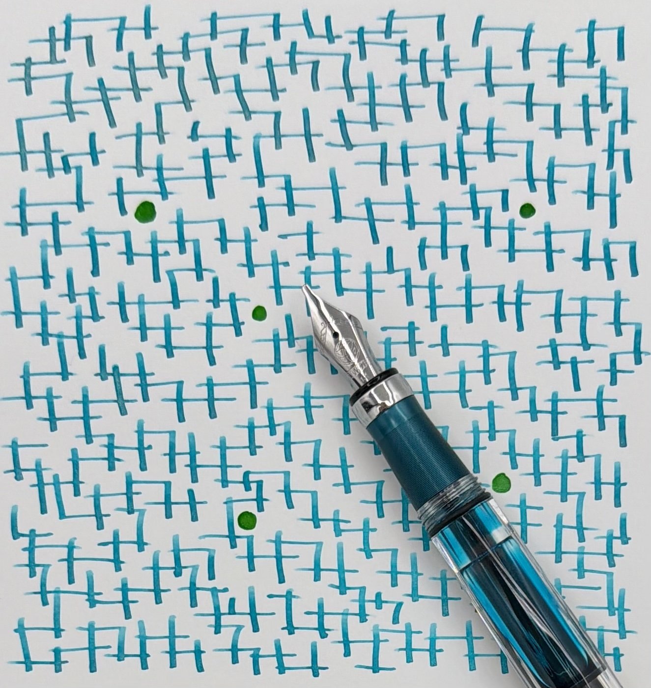 From a shimmer perspective, the volume of the sparkly stuff seems lighter than the aforementioned Opale Nocturne, and other shimmer inks I’ve used recently. Even those from Jacques Herbin. I’ve never had a flow problem with any of the Herbin shimmers, but lighter is ok by me. The flow was perfect in my 1.1 mm TWSBI stub nib, never missing a beat. You can see the shimmer in the barrel and on the page, but nowhere is it overwhelming.