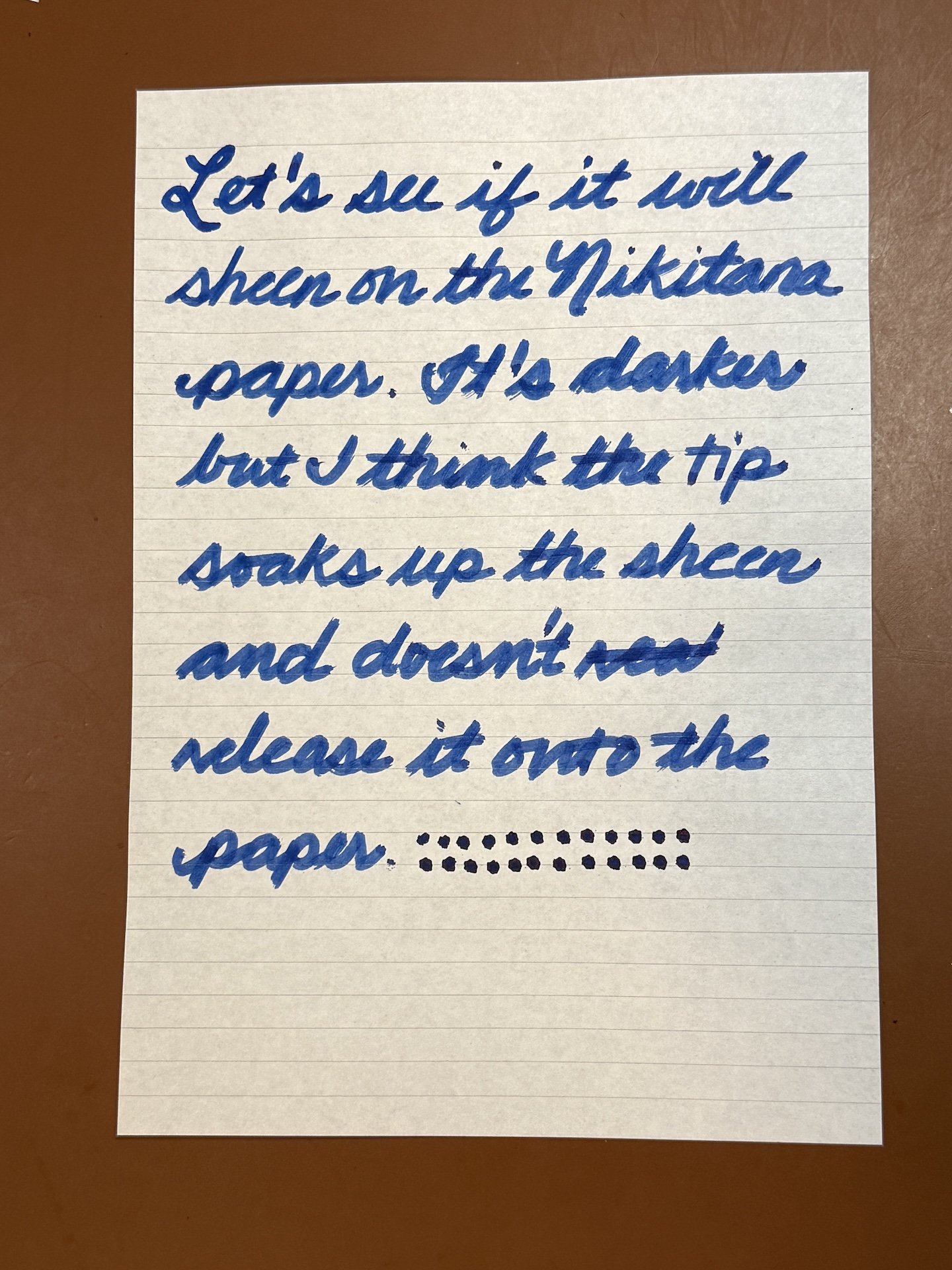Let’s see if it will sheen on the Nikitana paper. It’s darker but I think the tip soaks up the sheen and doesn’t release it onto the paper.