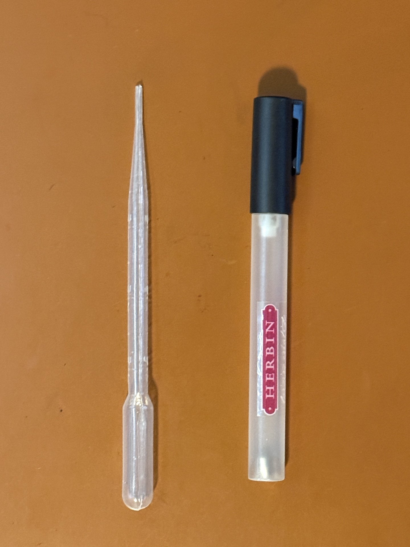 Plastic pipette (left) is included with the snap cap refillable marker.