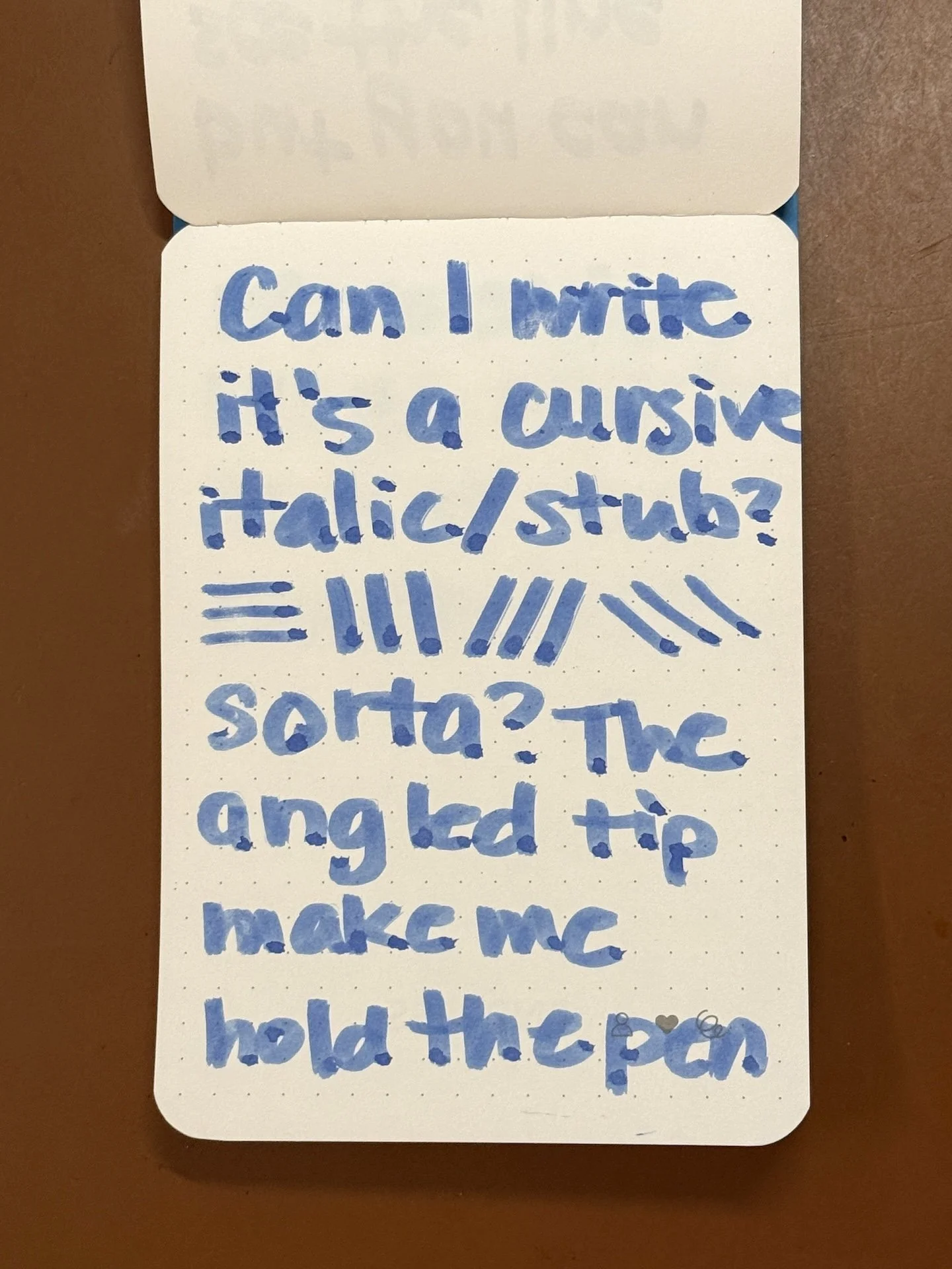 Can I write (like) it’s a cursive italic/stub? Sorta? The angled tip make me hold the pen (Jeebus, what kind of grammar is going on here? It’s the sideways chiseled tip’s fault!)