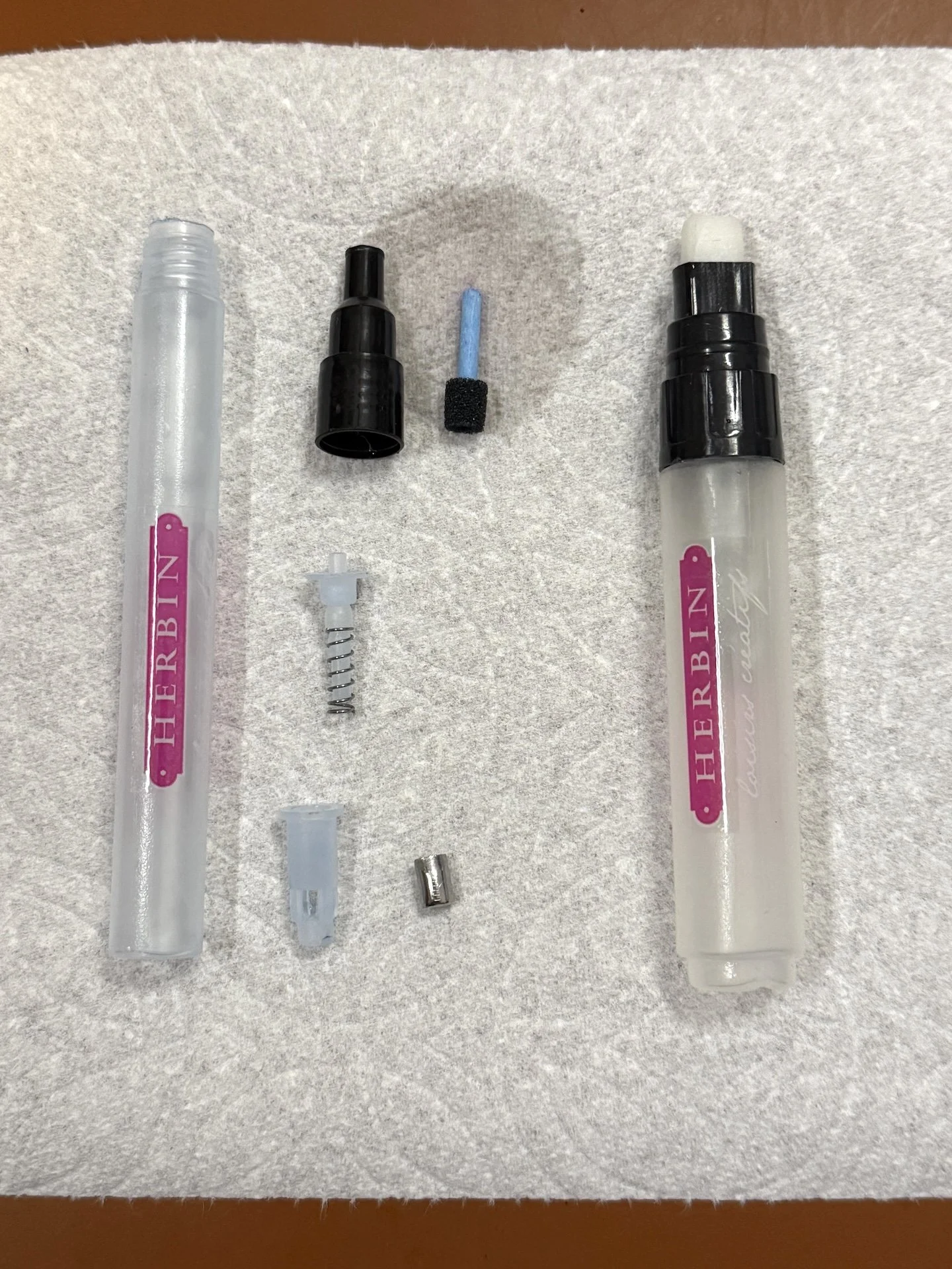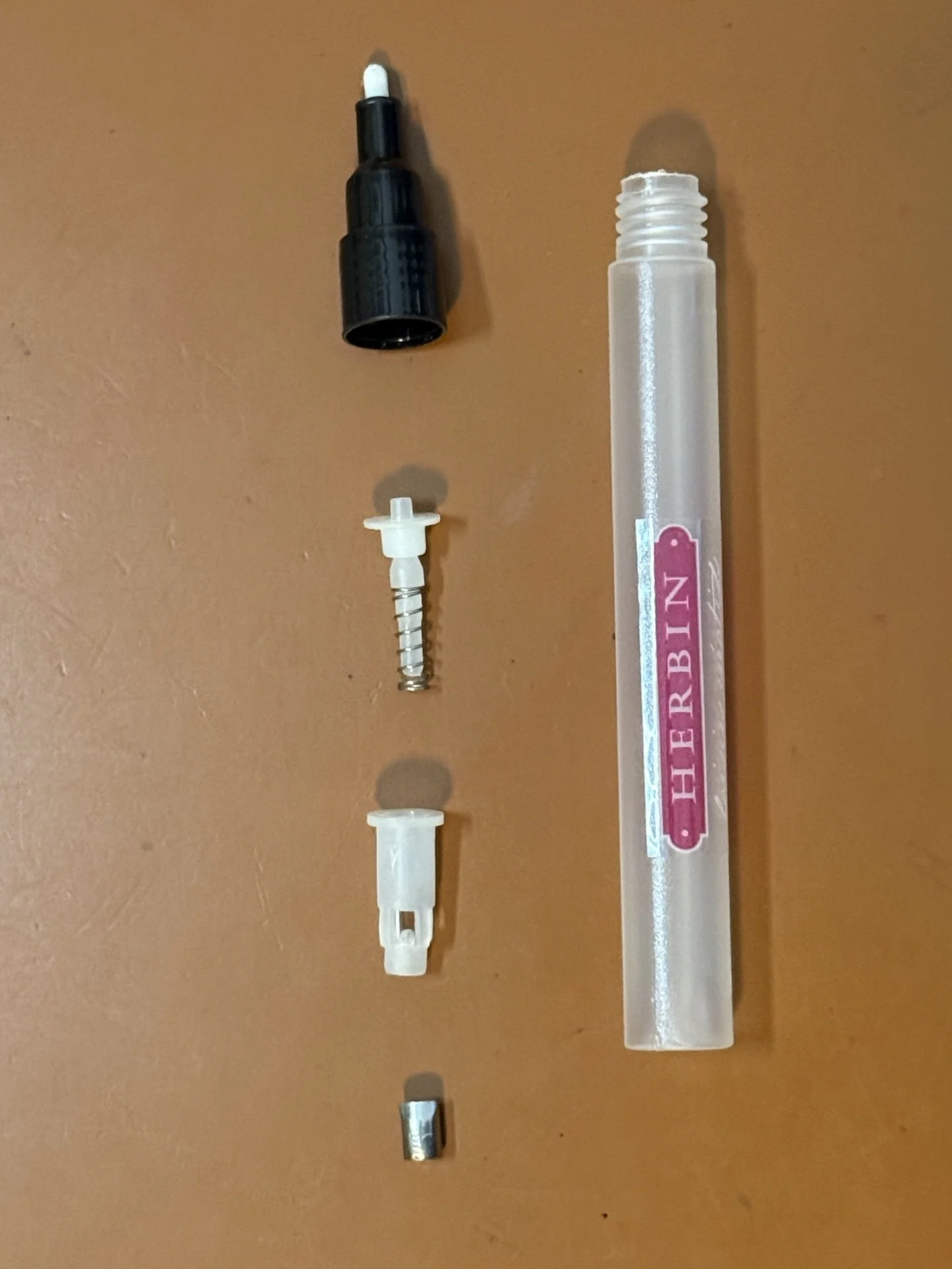 Aside from the cap (not pictured), the marker is composed of the barrel (right), the tip & cone/grip, a spring piece that sits inside a plastic “cup and a metal agitator.