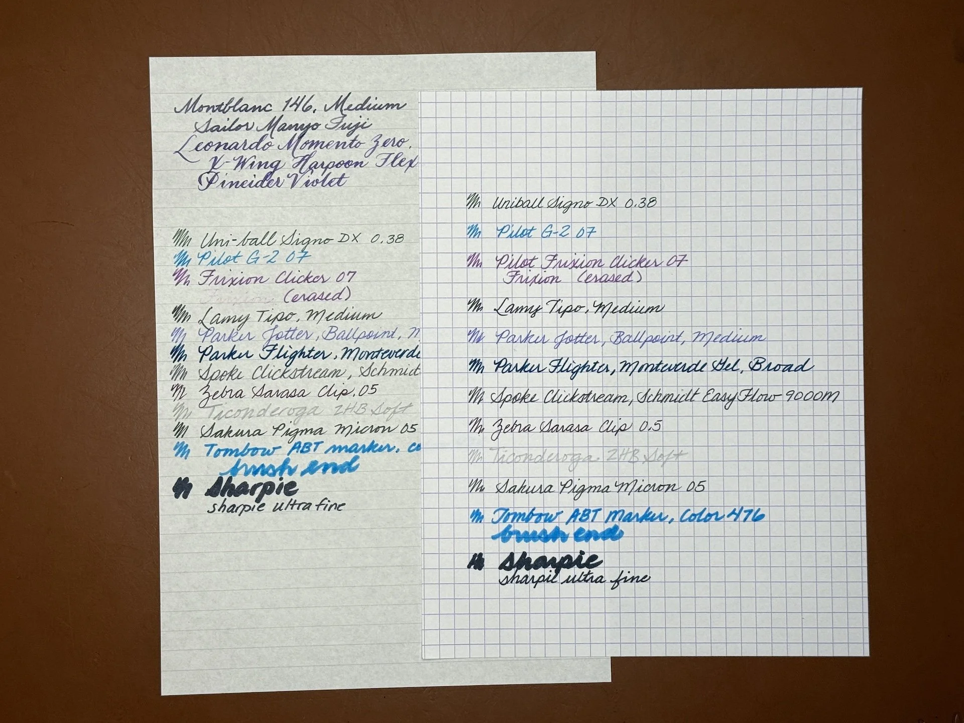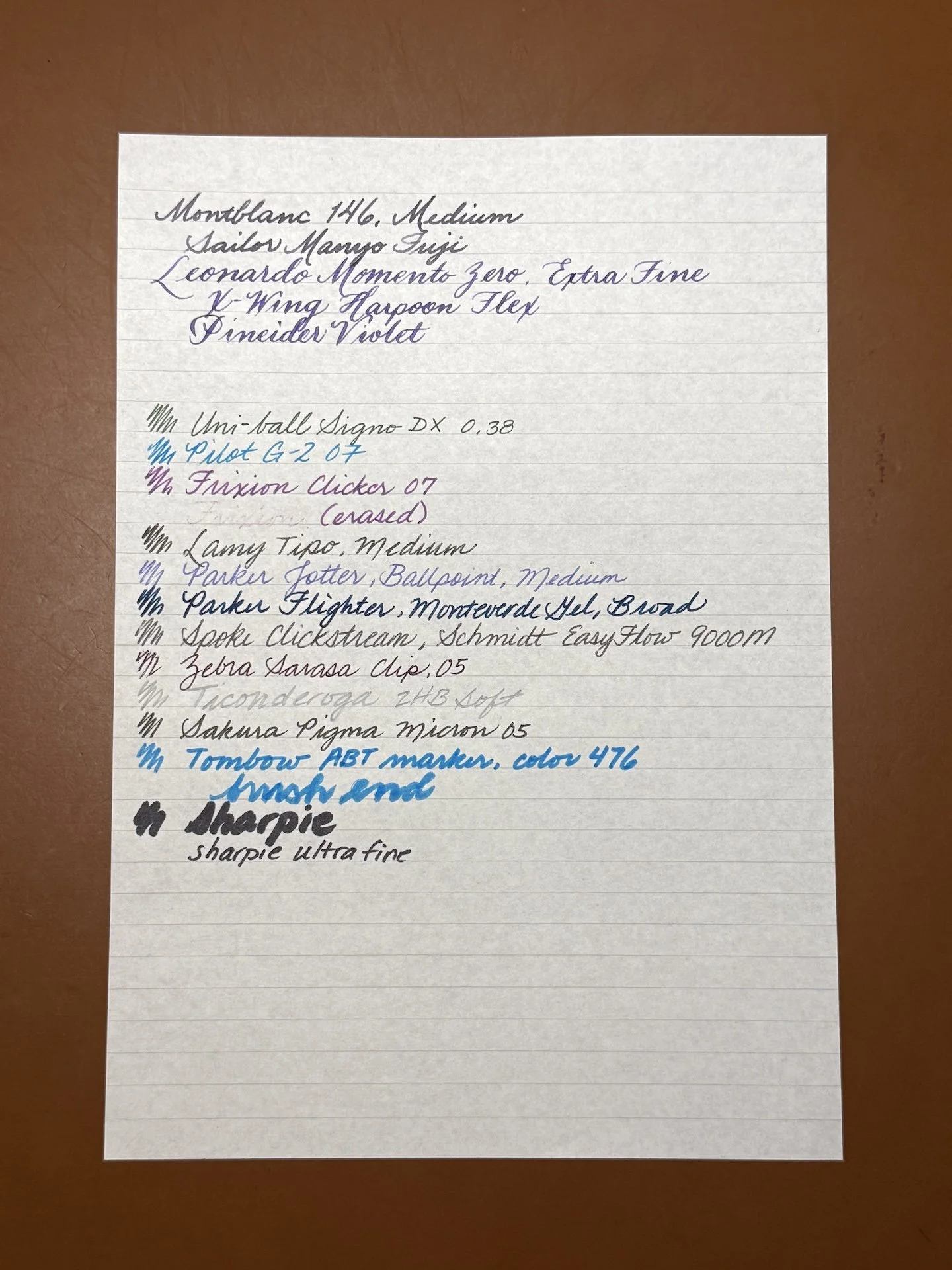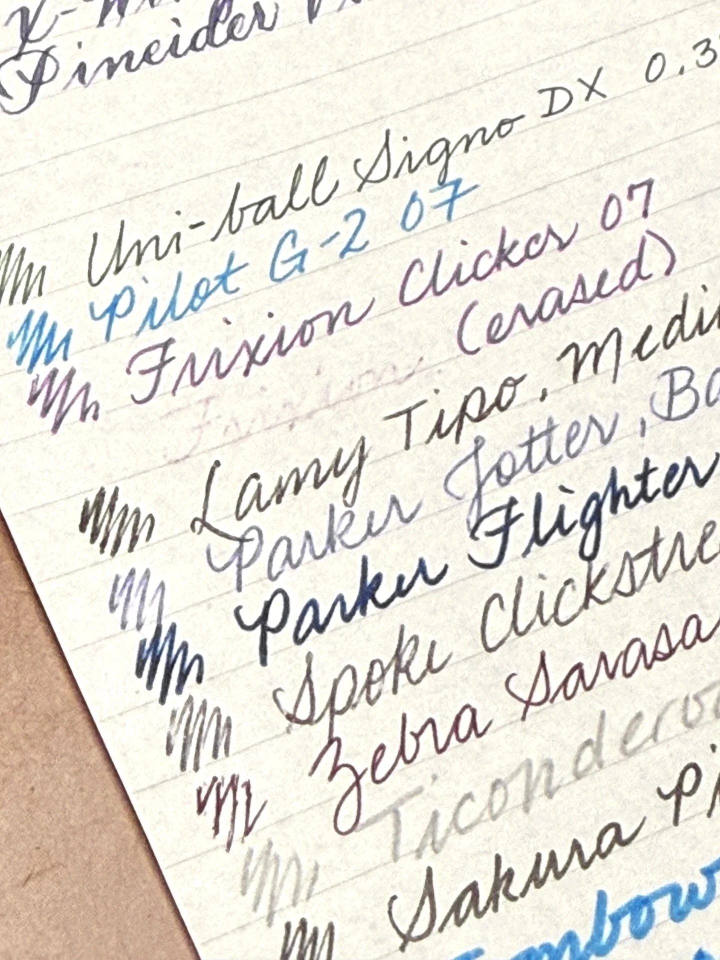 Standard pens (l to r): Uni-ball Signo DX, 0.38, Pilot G-2 07, Frixion Clicker 07, Lamy Tipo Medium, Parker Jotter, Ballpoint, Parker Flighter, Gel, Spoke Clickstream, Schmidt EasyFlow 9000 M, Zebra Sarasa Clip 05, Ticonderoga 2HB Soft, Sakura Pigma Micron 05, Tombow ABT, color 476, Sharpie. And yes, this is the same photo (and set of pens) that I’ve used for the last several paper reviews.