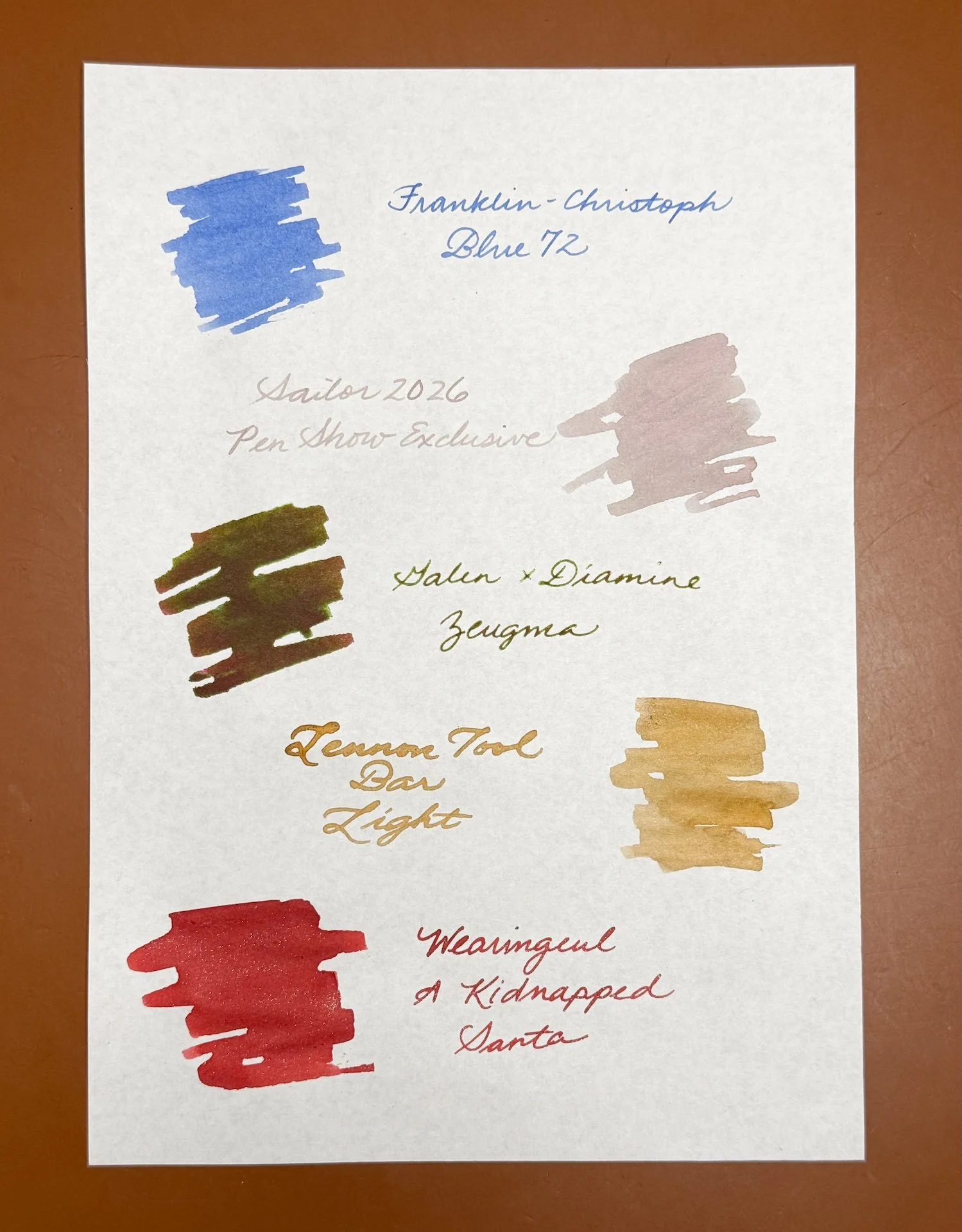 I swatched a few inks that were sitting in my to-be-swatched pile just to see how the paper would handle them. Franklin-Christoph Blue 72 (yes, this bottle was already on my desk), Sailor 2026 Pen Show Exclusive, Diamine x Galen Zeugma, Lennon Tool Bar Light, Wearingeul A Kidnapped Santa.