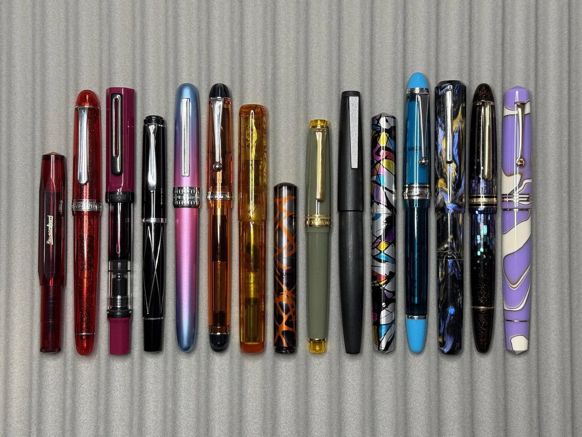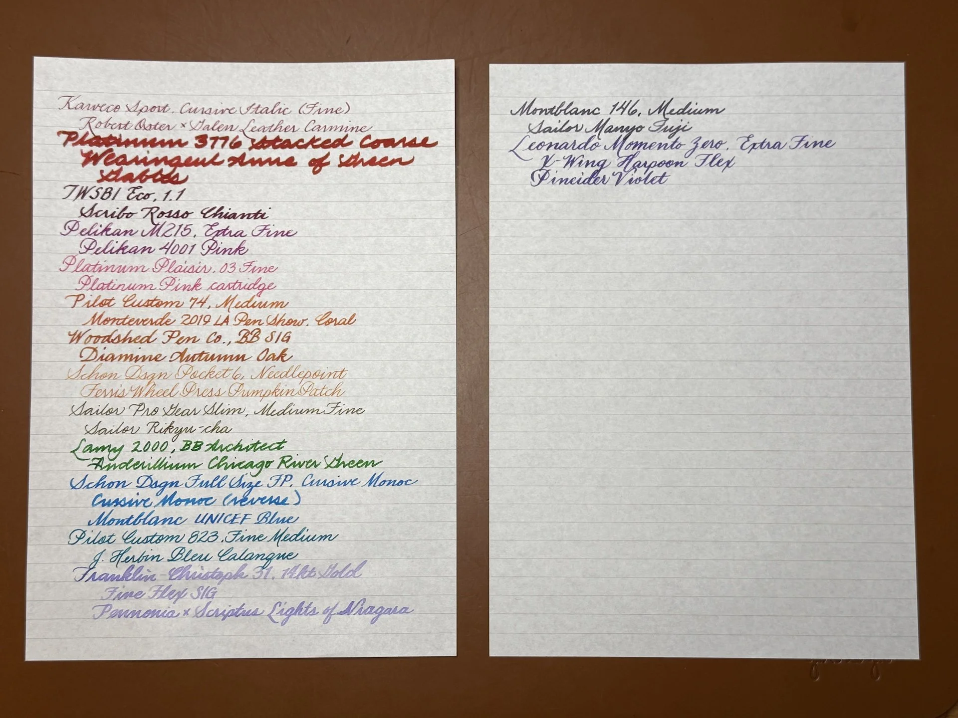 Left to right: Kaweco Sport (FCI), Platinum 3776 (stacked Coarse), TWSBI Eco (1.1), Pelikan M215 (Extra Fine), Platinum Plaisir (Fine), Pilot Custom 74 (Medium), Woodshed (BB SIG), Schon Pocket 6 (Needlepoint), Sailor Pro Gear Slim (Medium Fine), Lamy 2000 (BB Architect), Schon Full Size (Cursive Monoc), Pilot Custom 823 (Fine Medium), Franklin-Christoph 31 (Fine Flex SIG), Montblanc (Medium, Leonardo Momento Zero (Stylosuite EF X-Wing Harpoon flex).