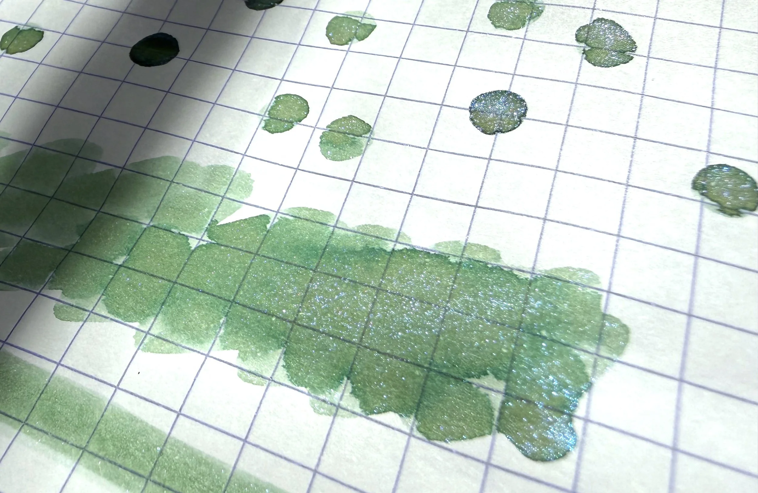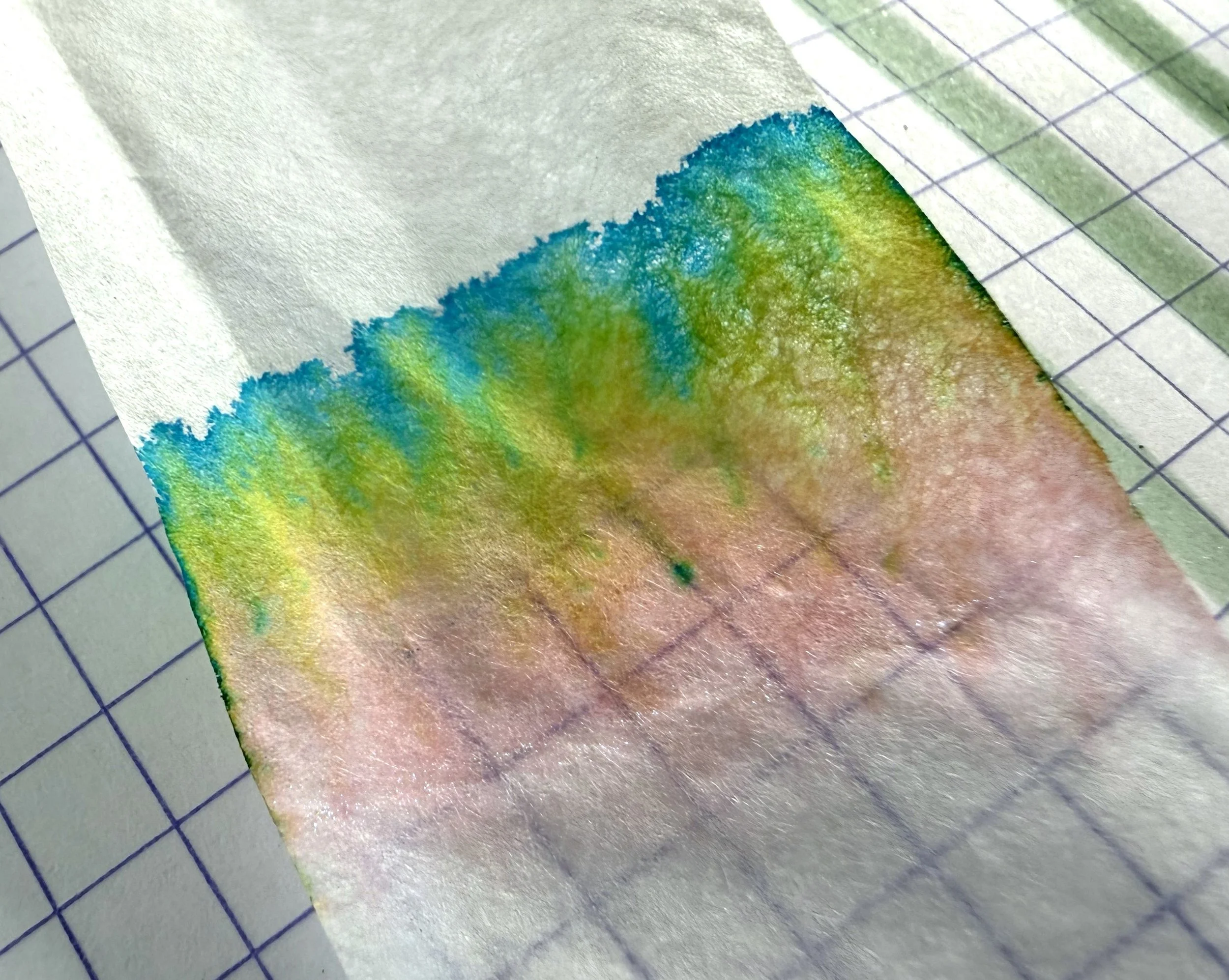 The ink base is a lovely celadon green with brown undertones that give it an olive hue, with an added fine blue shimmer. It's a stunning effect that looks like sunlight sparkling on a tropical sea. Of course, it also looks like its lizard namesake. And it's all my favorite colors in one. Chromatography shows its complex color formula, with a rosy coral orange, gold-green, and brilliant teal.