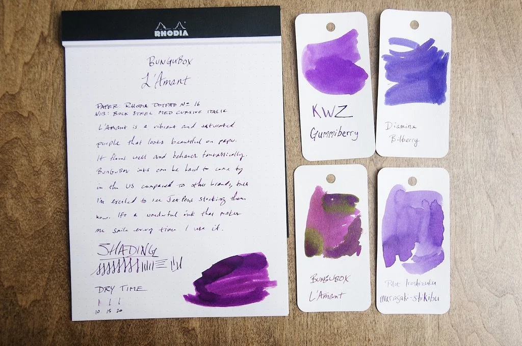 Bungubox has these 20ml bottles for 1818 Yen, or between $13-$14, which is a pretty good price, as some of their other inks can exceed a dollar per ml. It's still on the expensive side compared to other brands, however, where you might get 40ml for that price. For a well-behaved ink in a great color with fantastic sheen, I think it's reasonable, and I'm excited to see how its partner color behaves for other reviewers. I may need to pick up a bottle, myself!