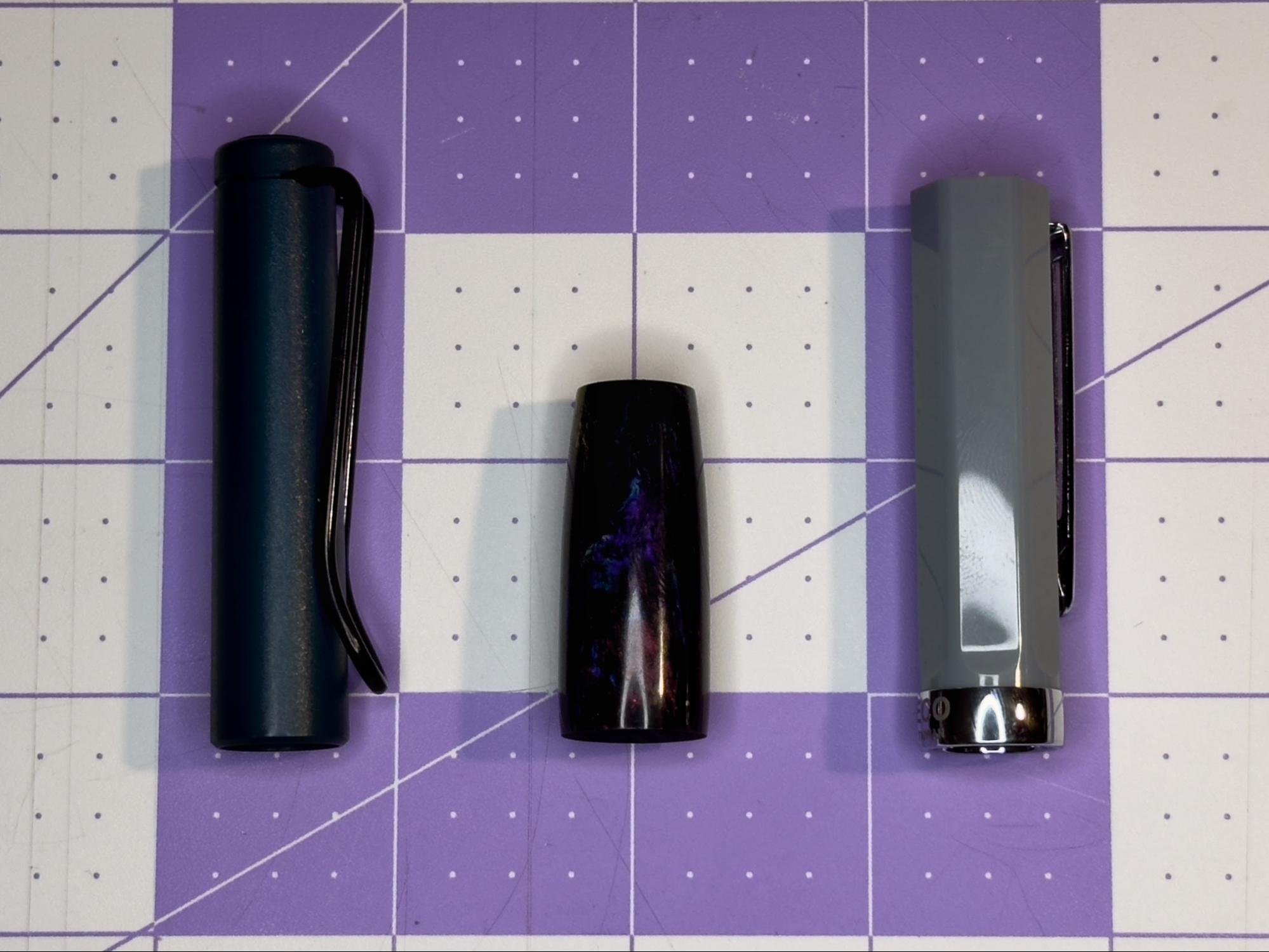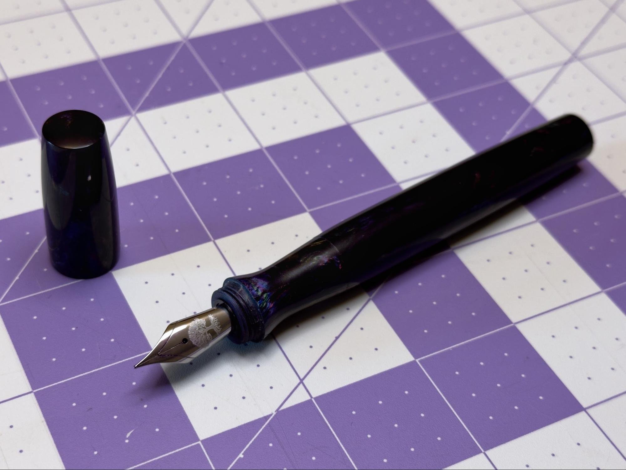 The Noldor is a cartridge/converter pen equipped with a steel Jowo #6 nib. The design consists of a smooth-sloping barrel with soft rounded corners and a pinched grip section. The shape of the pen is reminiscent of a glass vial or narrow flask, with seams that would be invisible were it not for the colorful resin mix. The grip section is reverse-threaded into the barrel (righty-loosy,) concealing the converter compartment. The Noldor is compatible with short and standard international cartridges and your typical Schmidt-style converter.