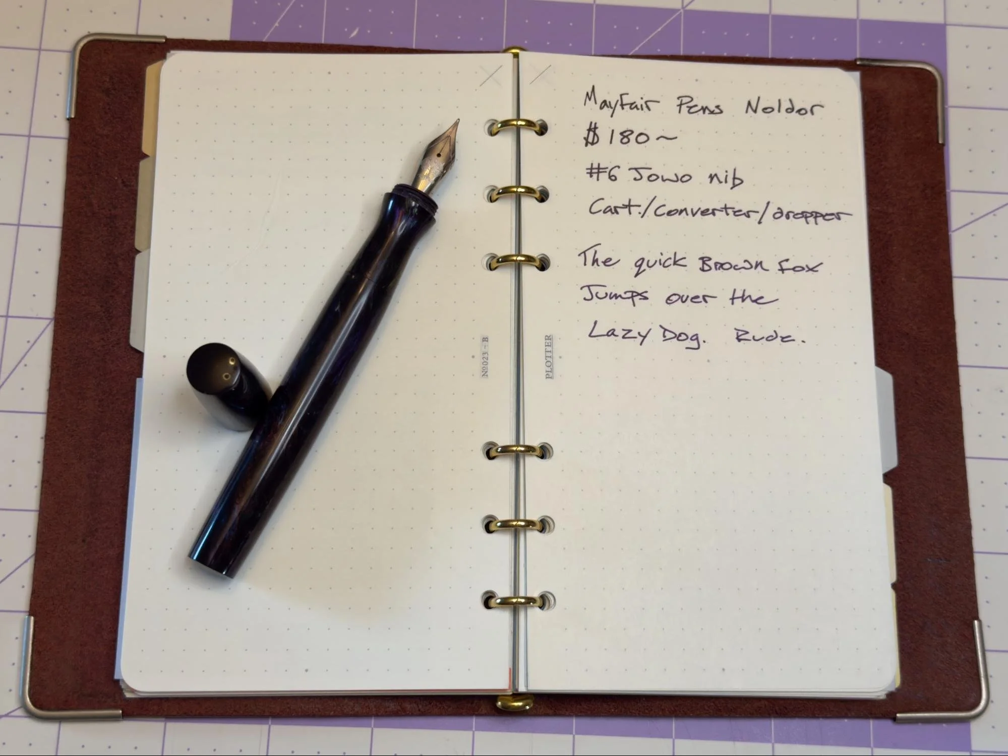 Let’s talk about value. The Noldor retails for $185, which is not a small ask. In fact, this comes very close to my limit when it comes to recommending pens. There are some considerations to be made, however, such as the source and (for lack of a better term) provenance of the pen. Strictly speaking, the experience of using a Noldor is not remarkably different from less-expensive products; Jowo nibs and converter fillers are not exactly rare. What sets Mayfair apart is the design and artistry that goes into each piece. From the resins to the shapes, these things are unique. The main difference in buying a Mayfair compared to a “Big Pens” $200 offering is that your dollars go directly to the person making the pen. There is a direct relationship between the piece you buy and the person you buy it from. There’s something special about that, and it cannot be replaced by a bit of gold or precious resin.